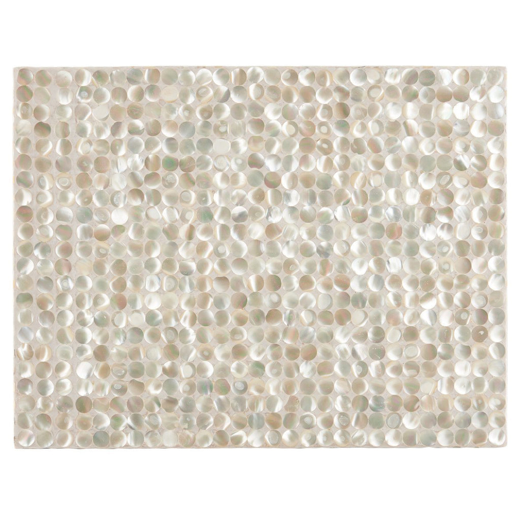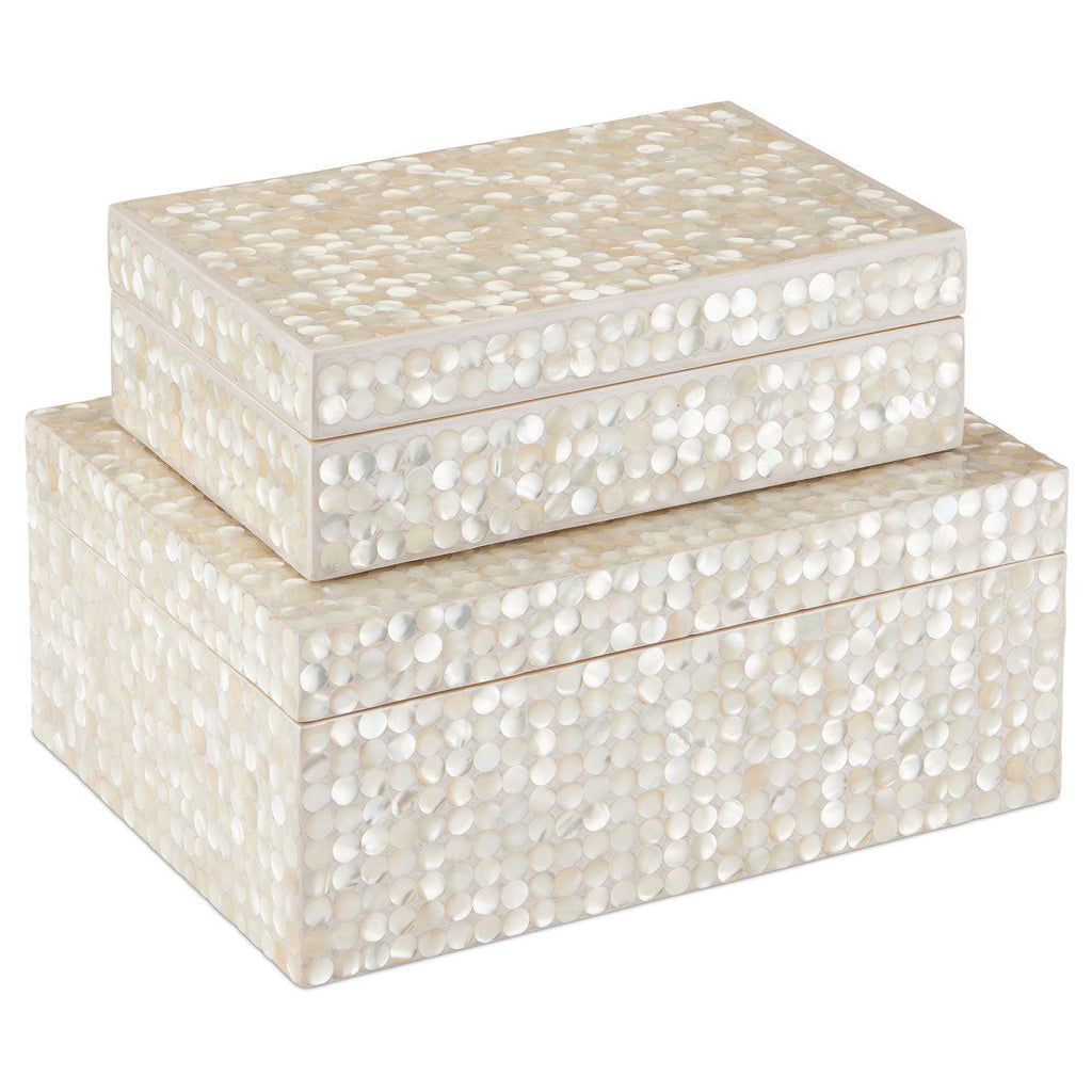 A shimmering duo of compositions, the Gerri Dot Box Set includes two white decorative boxes covered in tiny circlets of mother of pearl. The process of placing the material so uniformly on the sides and the top of these boxes is a painstaking process that takes hours to complete. The circlets are held in place by the composite into which they are set. The intermingling of crisp white and pale ivory pieces of shell brings these boxes added texture.