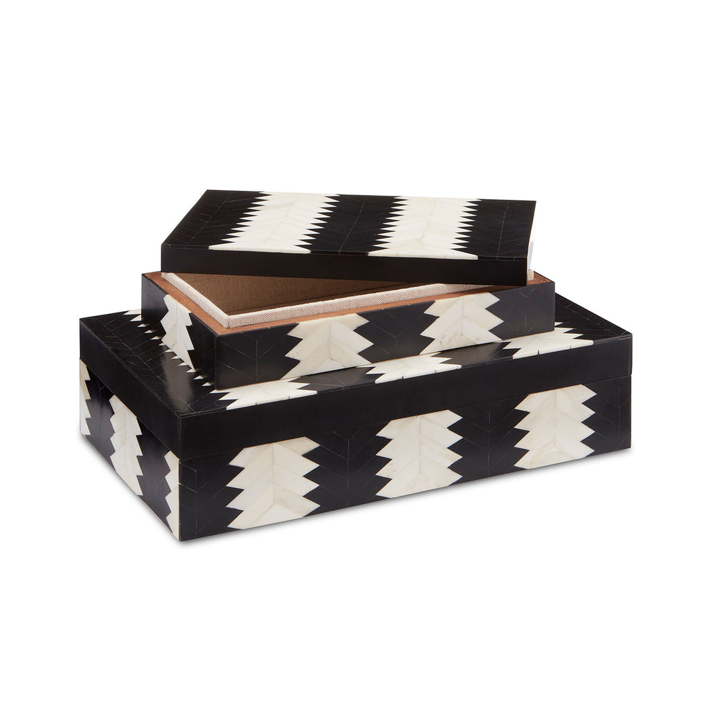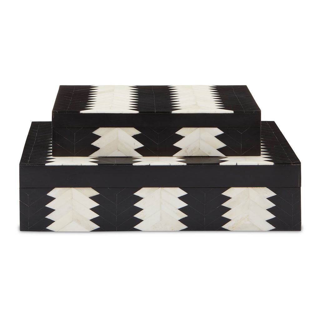 The Currey & Co Arrow Box Set, designed by Jamie Beckwith, is based on a strong graphic shape that comes alive with the contrast of bone and composite in ivory and black along the surface. Originally created in bold patterns for vertical and horizontal surfaces, Beckwith says of the Arrow, "This is a unique take on a chevron pattern. I was inspired by original French chevron parquets and this pattern is an updated version of that. There is a classic feel to this graphic shape with a modern take. It provides a strong underlying structure that bonds all the elements of a room together." Sold as set of two.