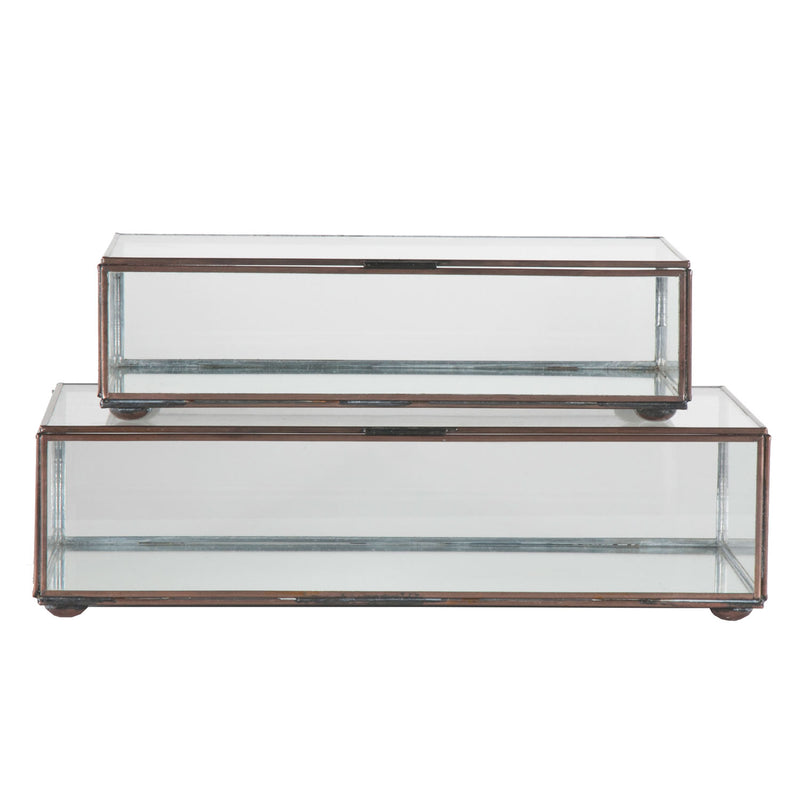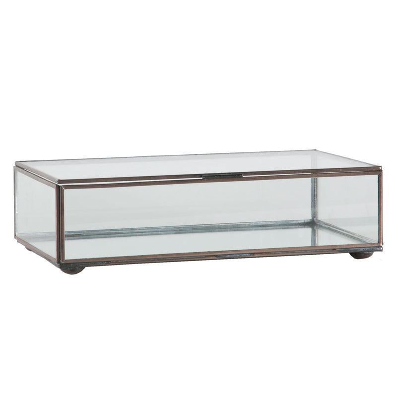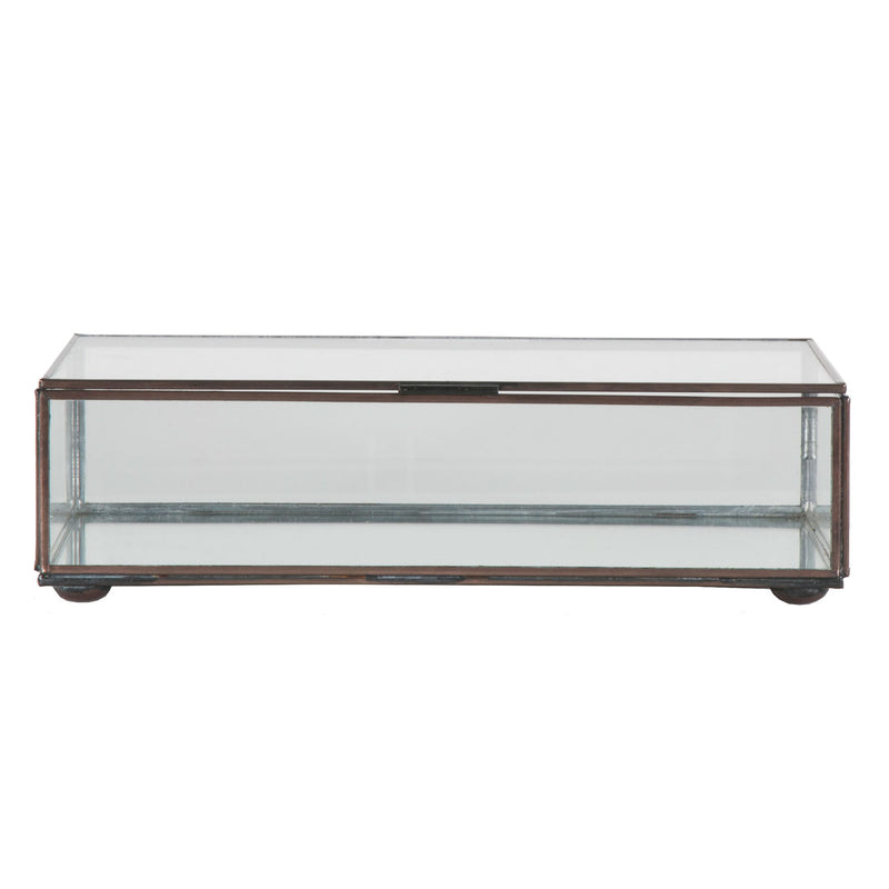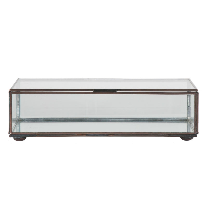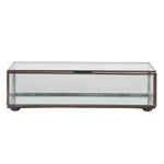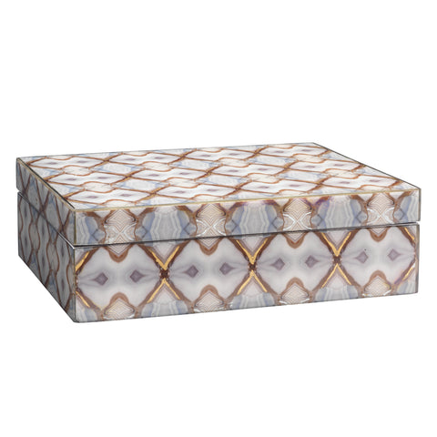 Cool touches of geometric style come to life on this box from Worlds Away. Its unique textures offer an alluring statement, while its sleek lines exude effortless modernity. This accessory delights upon a mantle or side table. Rectangular box with clear glass.