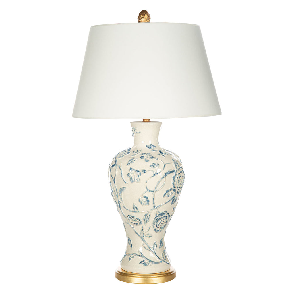 Traditional charm turns this ceramic table lamp into an artful upgrade for a bedroom or living space. Choose this elegant lamp for its creamy finish and soft, subtle carved floral surface with blue accenting. A warm gold leaf base and finial join a linen empire shade to complete a design-forward package that works in transitional spaces as well.