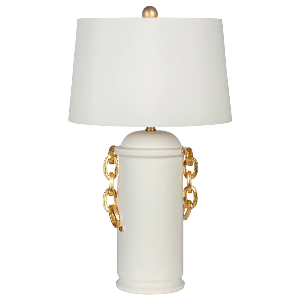 High fashion represents in the casual yet elegant design of the Blanc Channel table lamp; an excellent choice for sophisticated spaces. Crafted of creamy white ceramic, its layered cylindrical body is anchored with showy gold leaf chain accents and topped with a tasteful white linen drum shade.