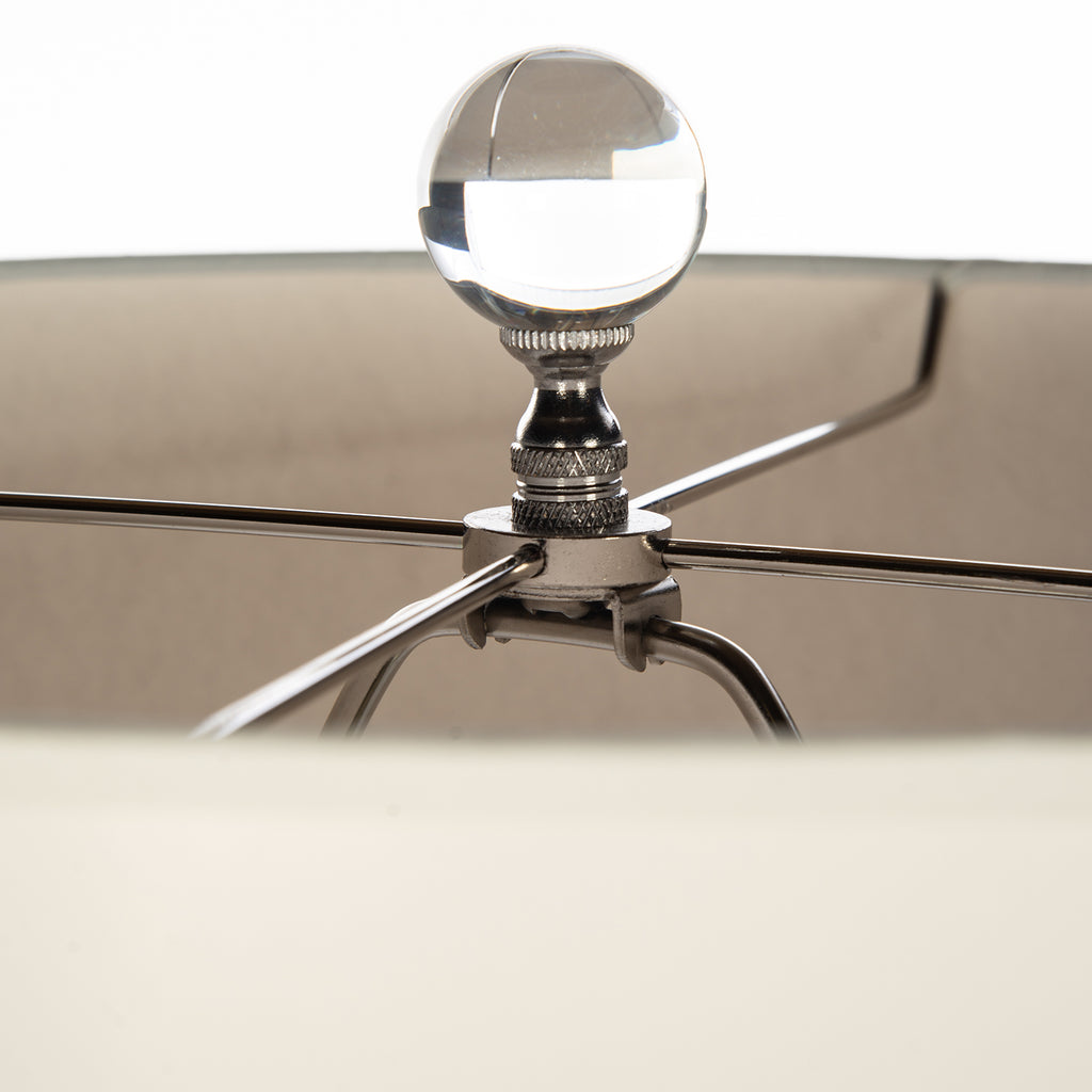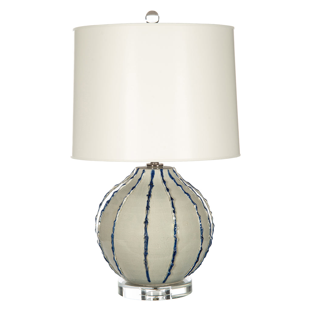 Take on a new look in a transitional space with a ceramic lamp that captures a hint of retro influence and Mid-Century Modern style. This tasteful lamp features a neutral finish ceramic gourd silhouette body with clever vertical veining in navy blue to keep it interesting. Perched on a clear glass base and topped with a cream parchment shade, it preserves the motif of a classic look and adds classic beauty to a modern or transitional bedroom or main living space.