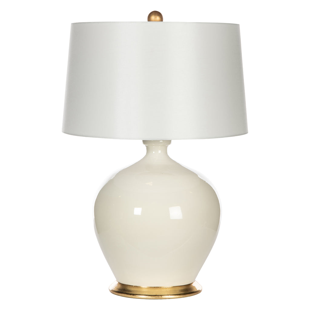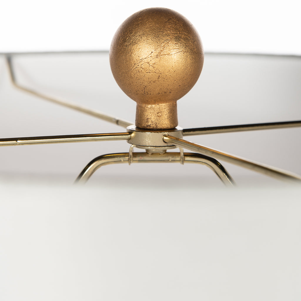 White bulbus urn with gold leaf base and gold leaf ball finial.