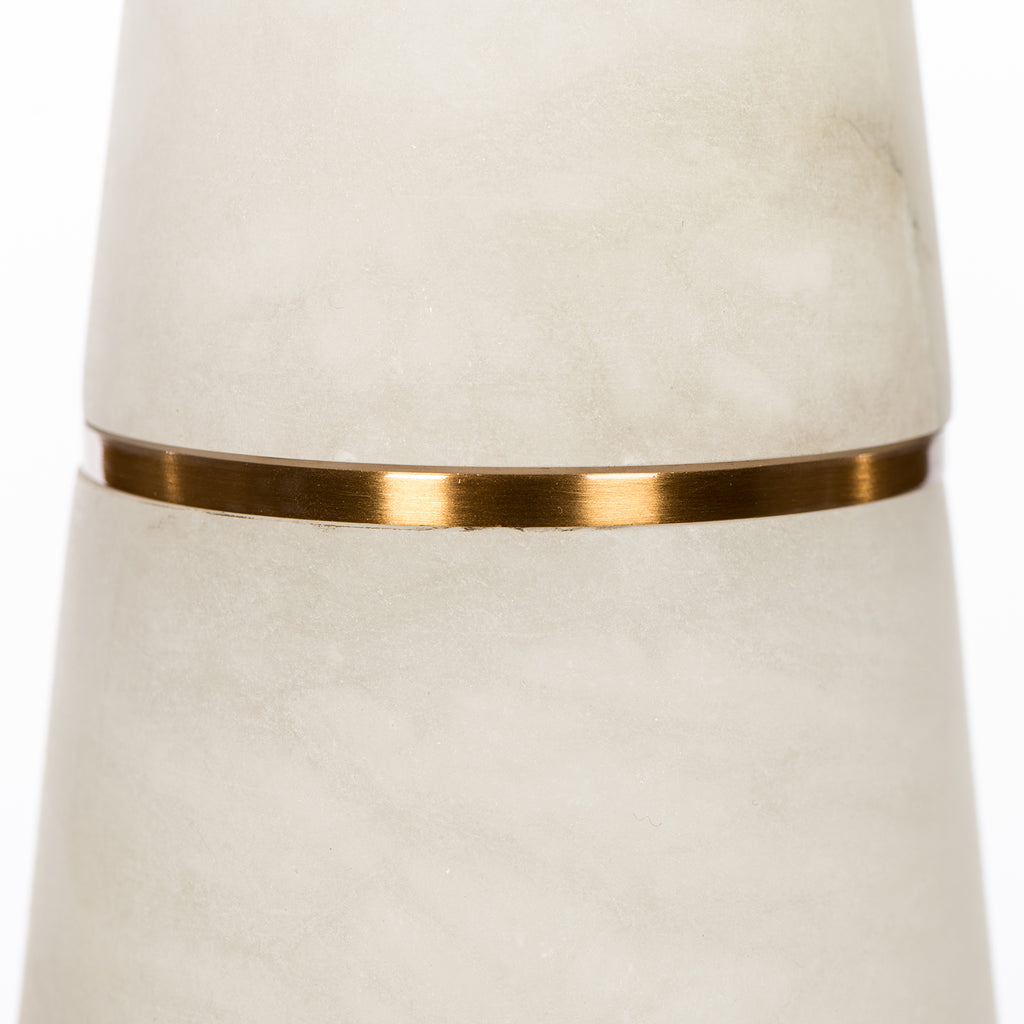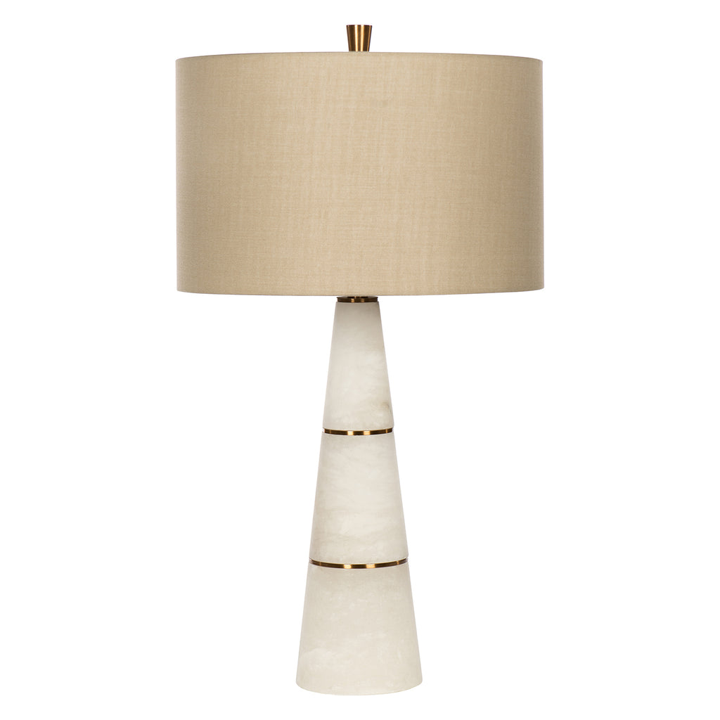 Embrace the clean, contemporary silhouette of this gorgeous marble table lamp. A gorgeous white alabaster cone is bisected with a pair of thin coffee bronze finish collars that add dimension and depth to exquisite design. Its tan linen drum shade adds inviting warmth and provides wonderful ambient illumination.