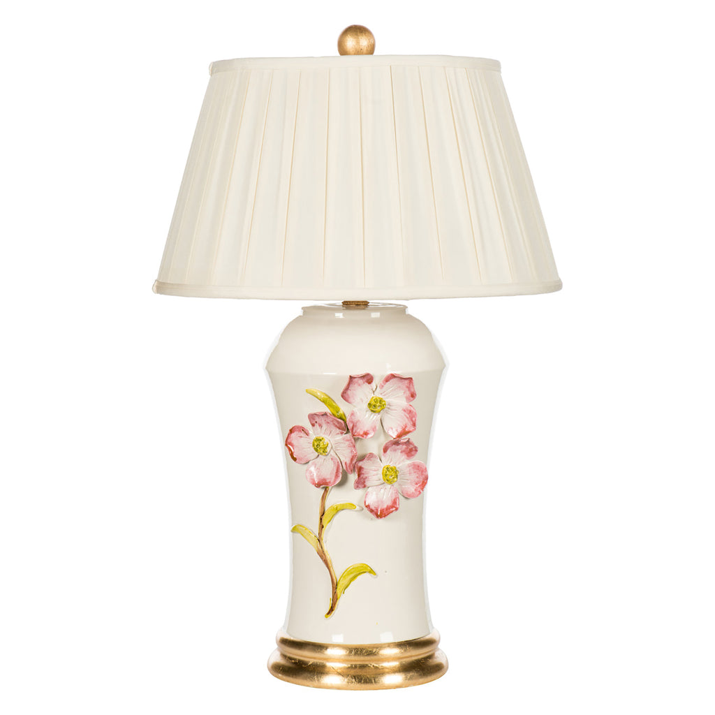 Embossed dogwood leaves and blooms are meticulously and lovingly finished in pink to bring feminine character to this traditional ceramic table lamp. It's a hand-crafted design made on the potter's wheel in Florence, Italy for exceptional quality and craftsmanship. A silk box-pleated shade and gold leaf base add decorative and functional elegance to this incredible design.
