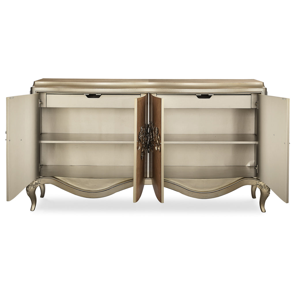 Flawlessly designed, this exquisite buffet channels the bold beauty and classic motifs of the Rococo period and interprets them for modern living. Its unique personality is brought to life with a sculptural flower and vine metal casting displayed across its shaped front. A trio of signature shades—Cendre, Champagne Mist, and Aglow—highlights this buffet’s classic silhouette while adding depth to its veneers and carvings. The interior is finished in Champagne Mist and features a drawer and adjustable shelf behind each pair of doors. Cabriole legs with floral carvings lend a finishing touch to this fine furnishing while adding another element of Rococo-inspired character.