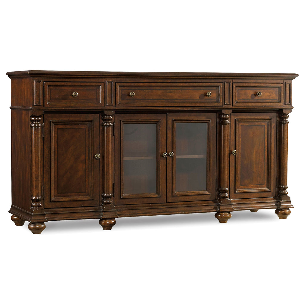Set a tone of gracious hospitality with the striking Leesburg Buffet. Featuring classical design motifs with a fashionable flair, the functional piece has 3 drawers with a felt liner in the right drawer and a silverware tray liner in the center drawer. The wood-framed beveled glass center doors each have a wood shelf . Crafted of Mahogany Veneers, the buffet has a rich traditional finish with elegant cathedral and swirl mahogany veneers with light physical distressing and custom-designed knobs with an antique brass finish.