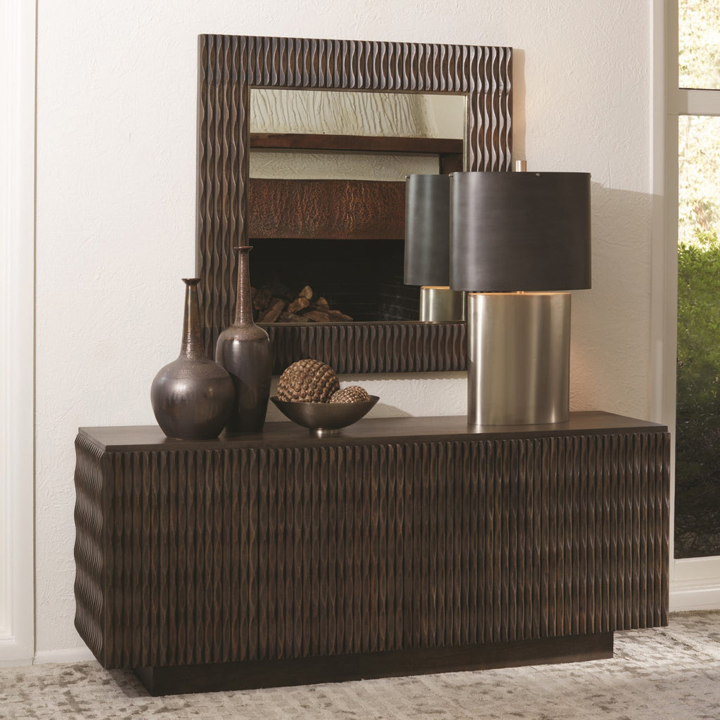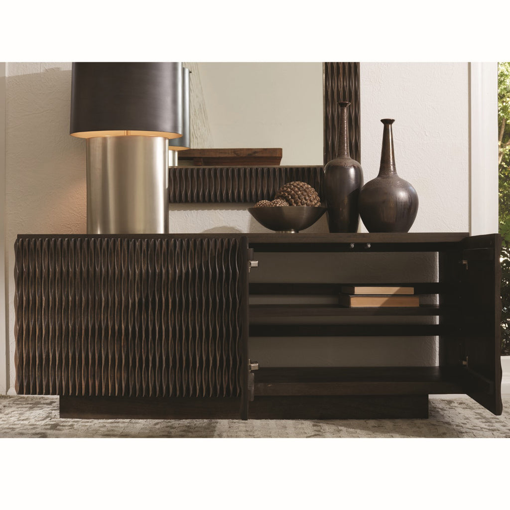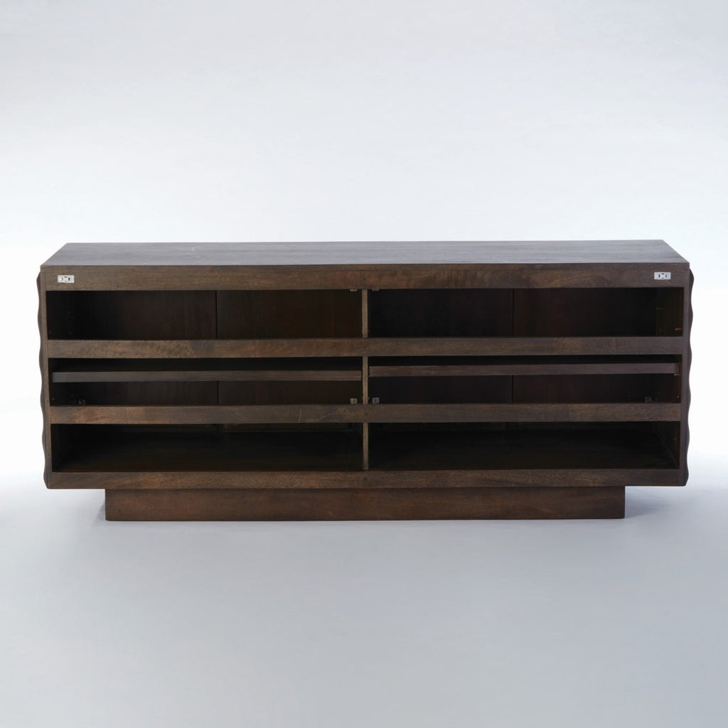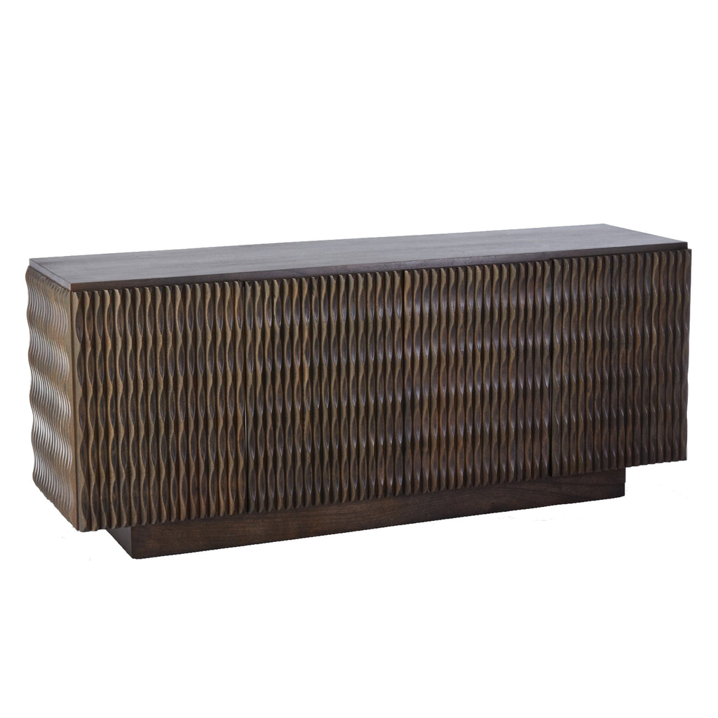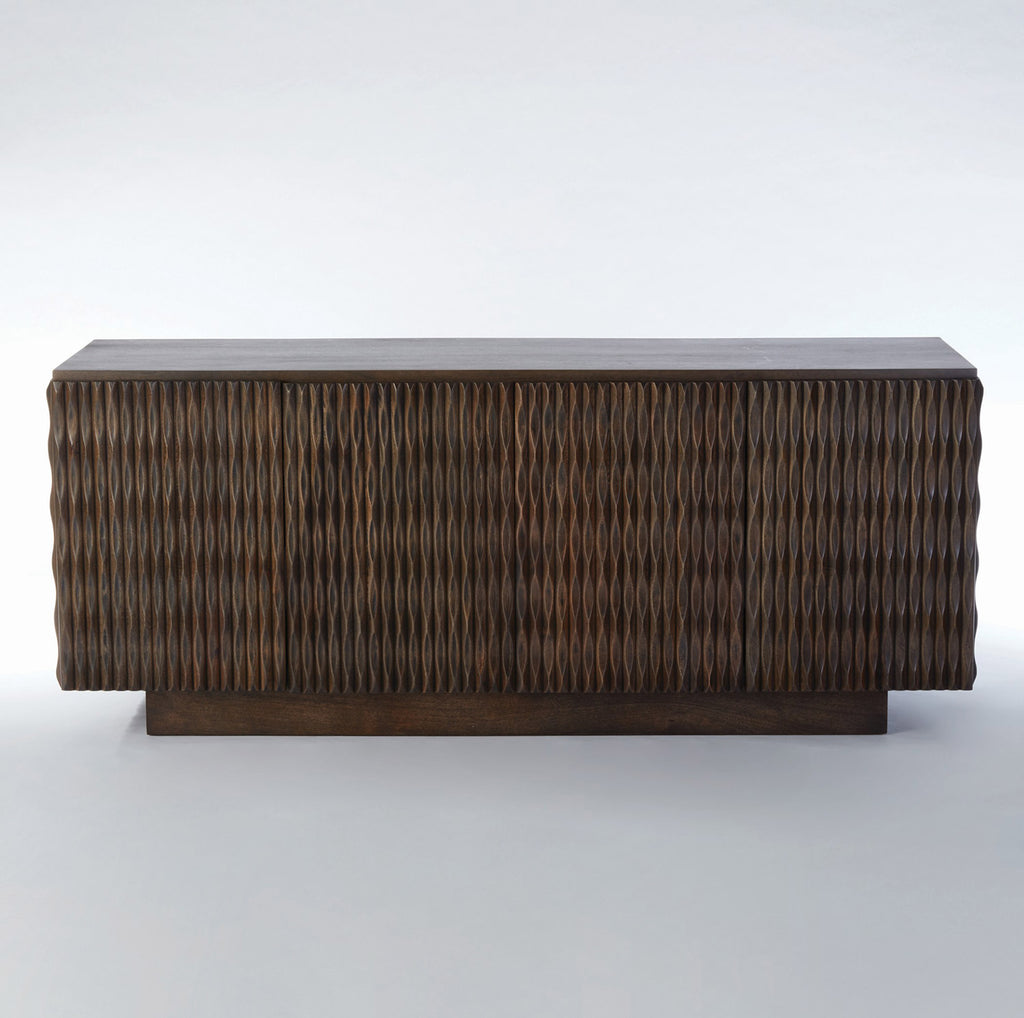 As lights plays on the curvaceous carved surfaces of the Studio A Minuet buffet, it is subtly transformed with the changing light from day to evening. The waves of precision carving on three exposed sides give the media cabinet an aura of fluid energy and dimension. Minuet rests on a smooth plinth base. Carved mango wood with rich greyed walnut finish. Touch latches on cabinet doors. One adjustable shelf in each section. Slatted back allows for easy access to media components.