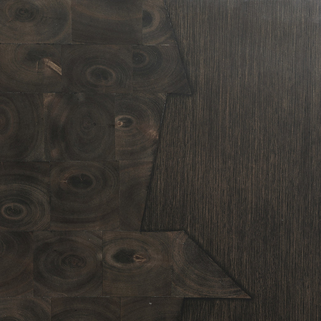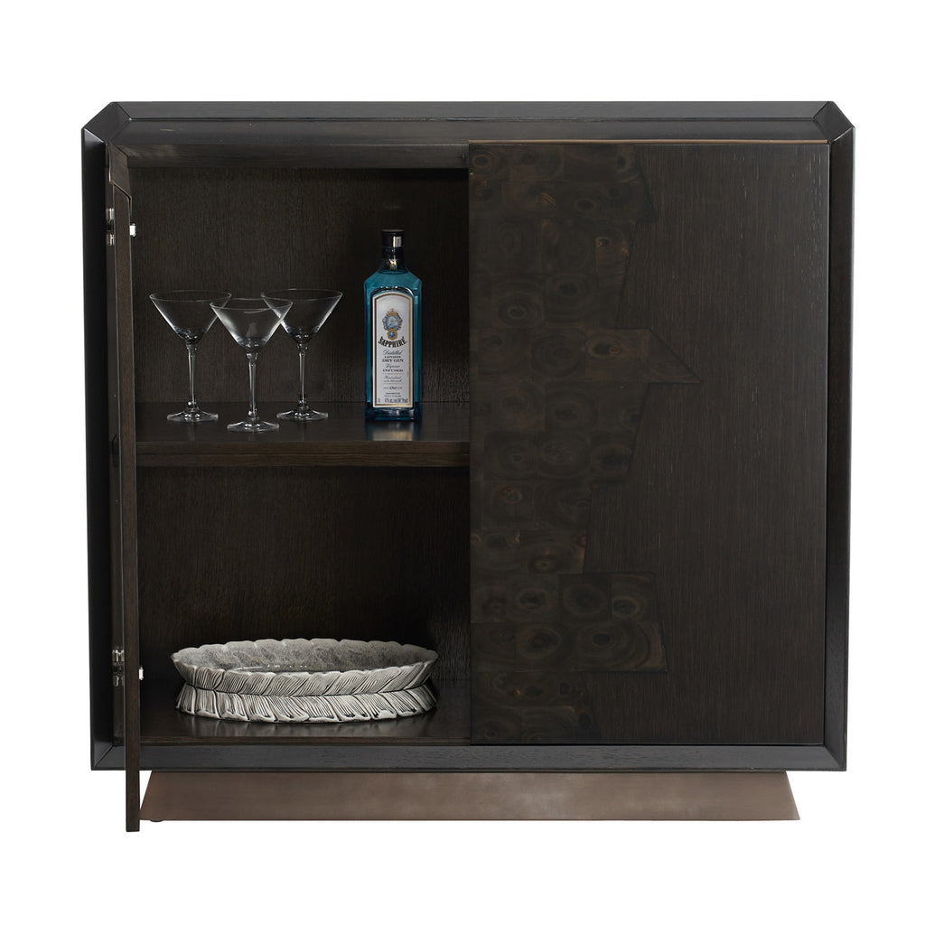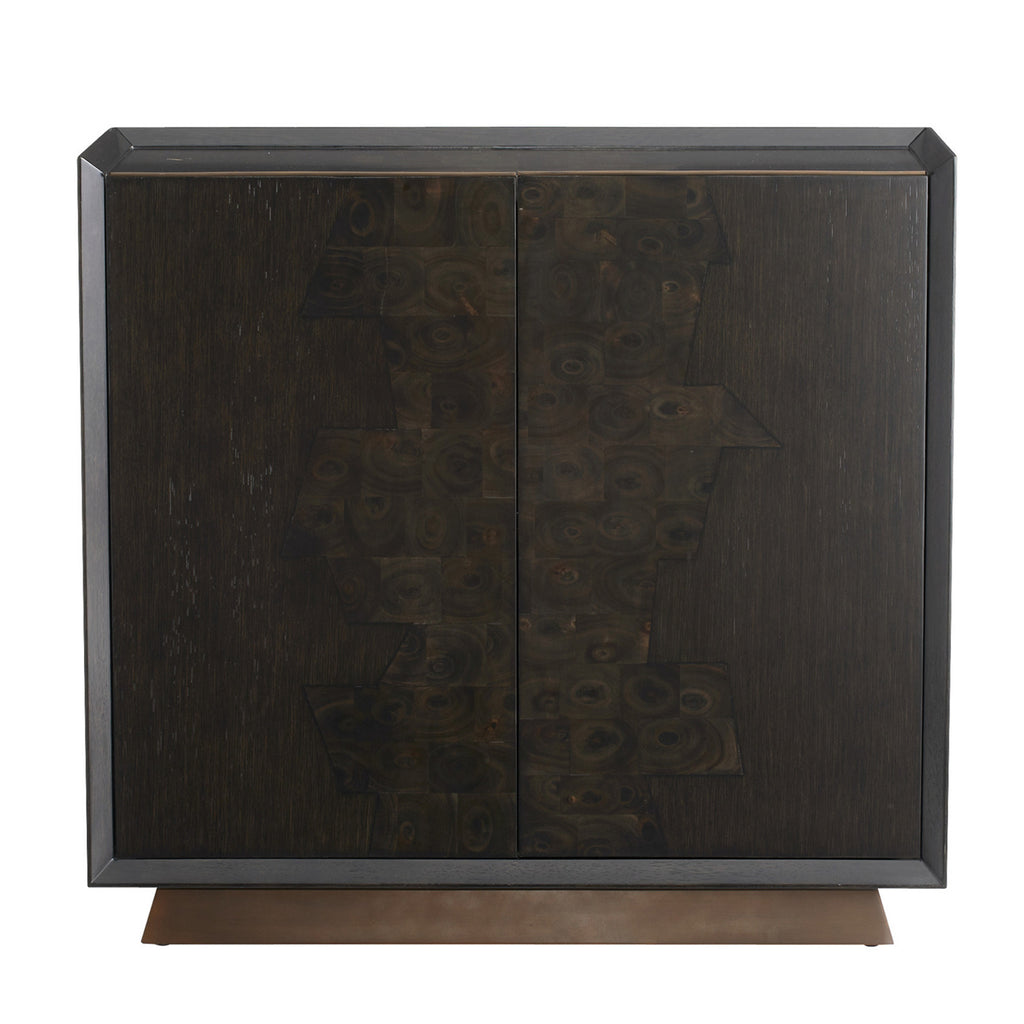 A truly refined cabinet, Hudson showcases a historic oystering parquetry technique—the sable oak veneer framed with matching veneer and topped by antique brass accents. The recessed top, chamfered profile, and finger-pull doors give it architectural elegance. Its single adjustable shelf adds functional versatility; finish will vary.