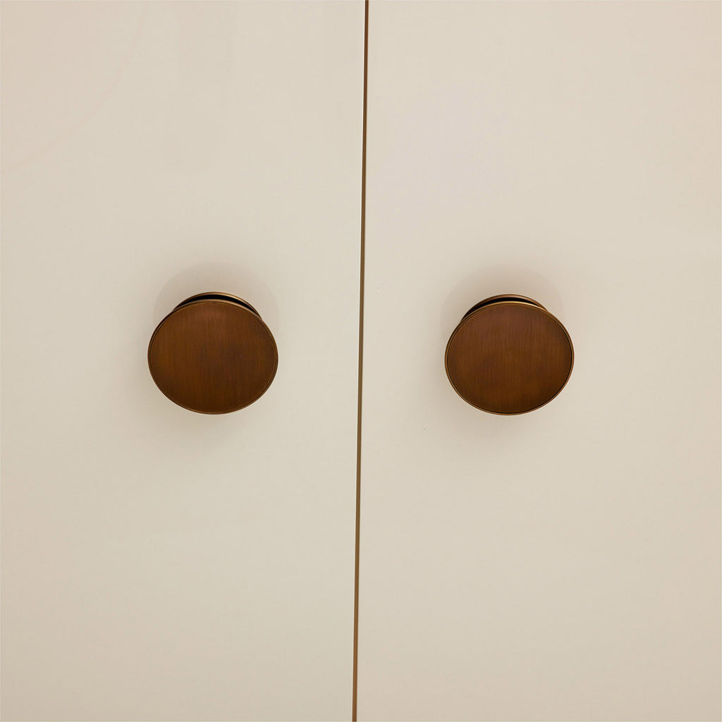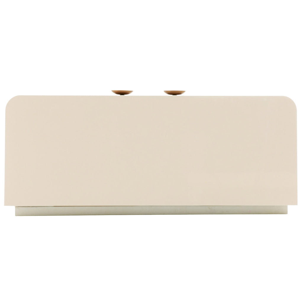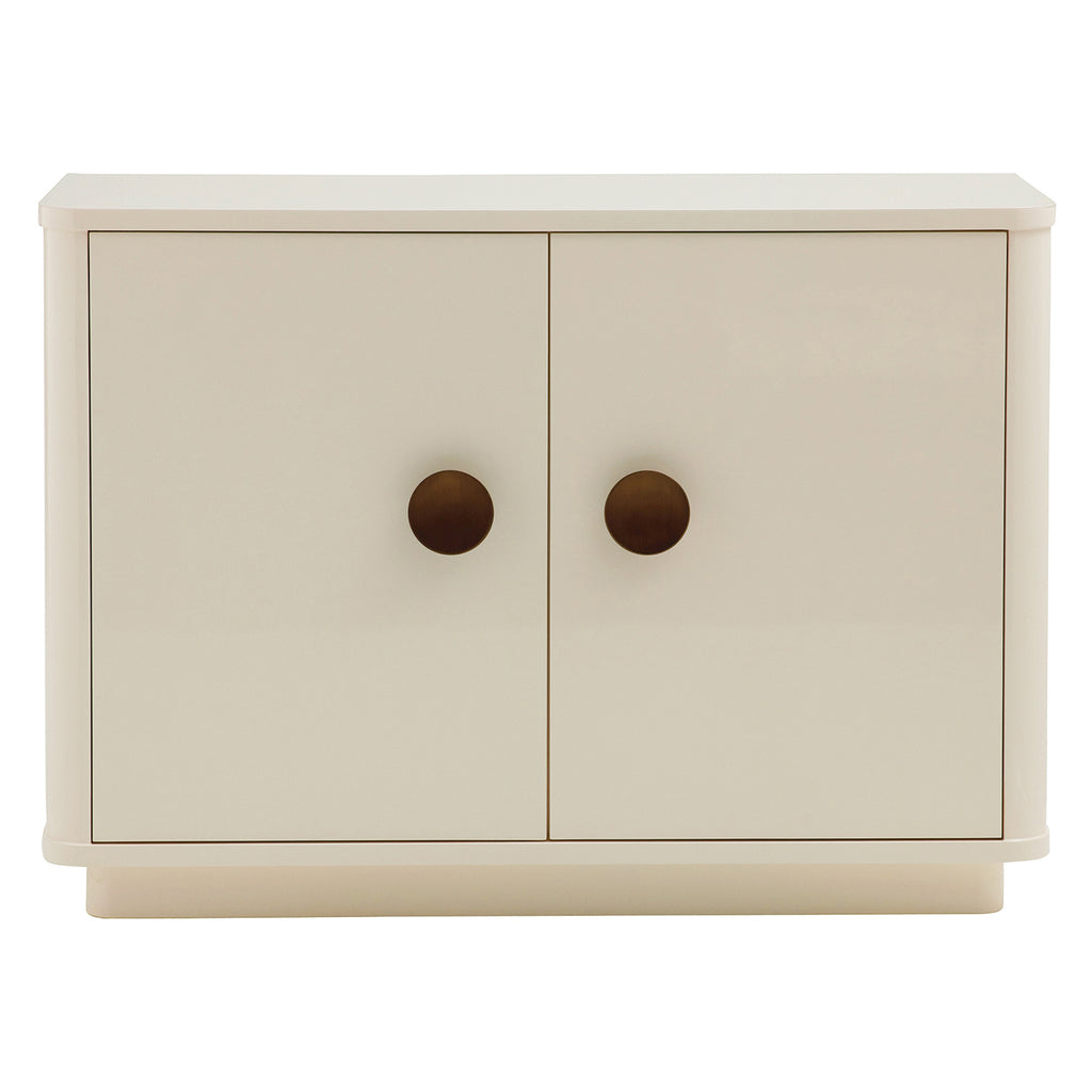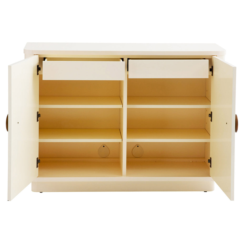 The high-gloss finish of opal lacquer oak chest will bring a bold and glamorous statement to any room . Perfectly radiused corners and oversized vintage brass hardware intensify the sleek design. Two drawers and adjustable shelves provide ample storage.