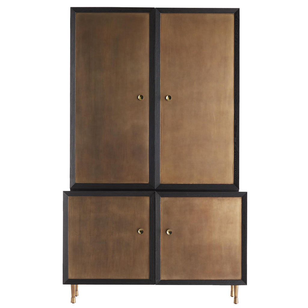 Bold and burnished, the Kilpatrick Tall Cabinet juxtaposes rich ebony-stained oak with burnished gold-leaf accents. Designed with heritage sensibility and contemporary flair, it includes cast-brass hardware, European hinges, foot levelers, and functional organization features like 2 soft-close drawers and 8 total shelves (5 adjustable). Finish will vary.
