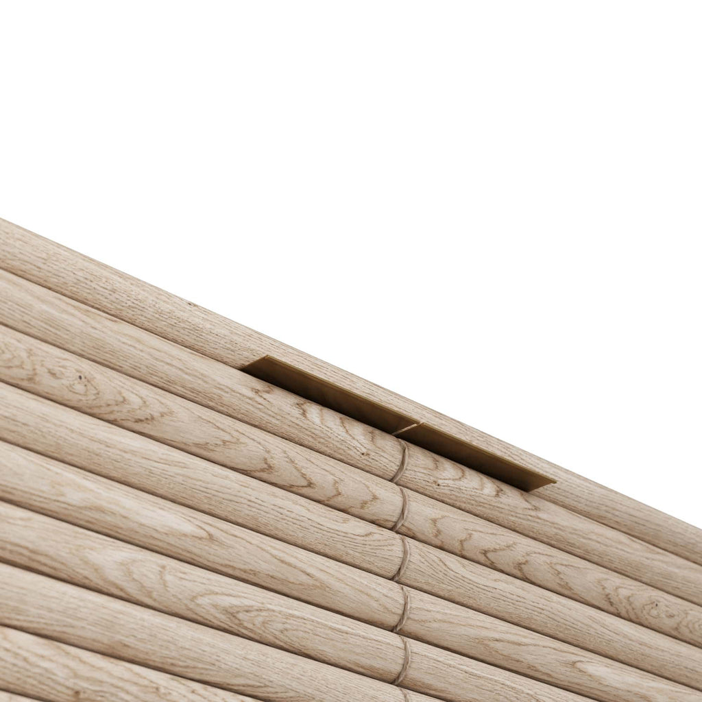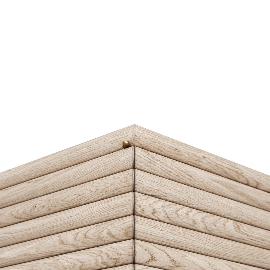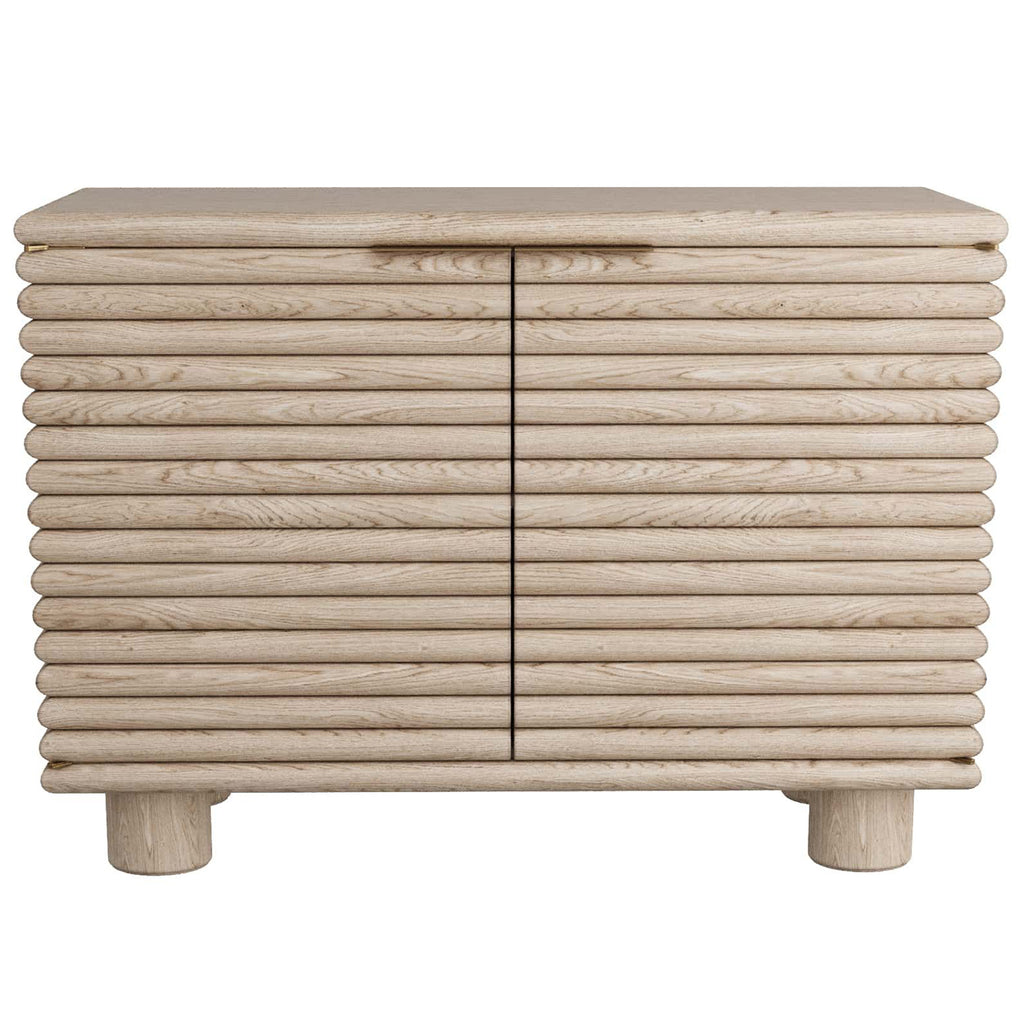 Channeled, smoke oak veneer with mitered edges, and round cylindrical legs contribute to the Arteriors Seine’s soft, modern aesthetic. The small-scale cabinet, finished with contrasting, vintage brass finger-pull hardware, adds texture and interest to any space in need of a little something special. Finishes will vary.
