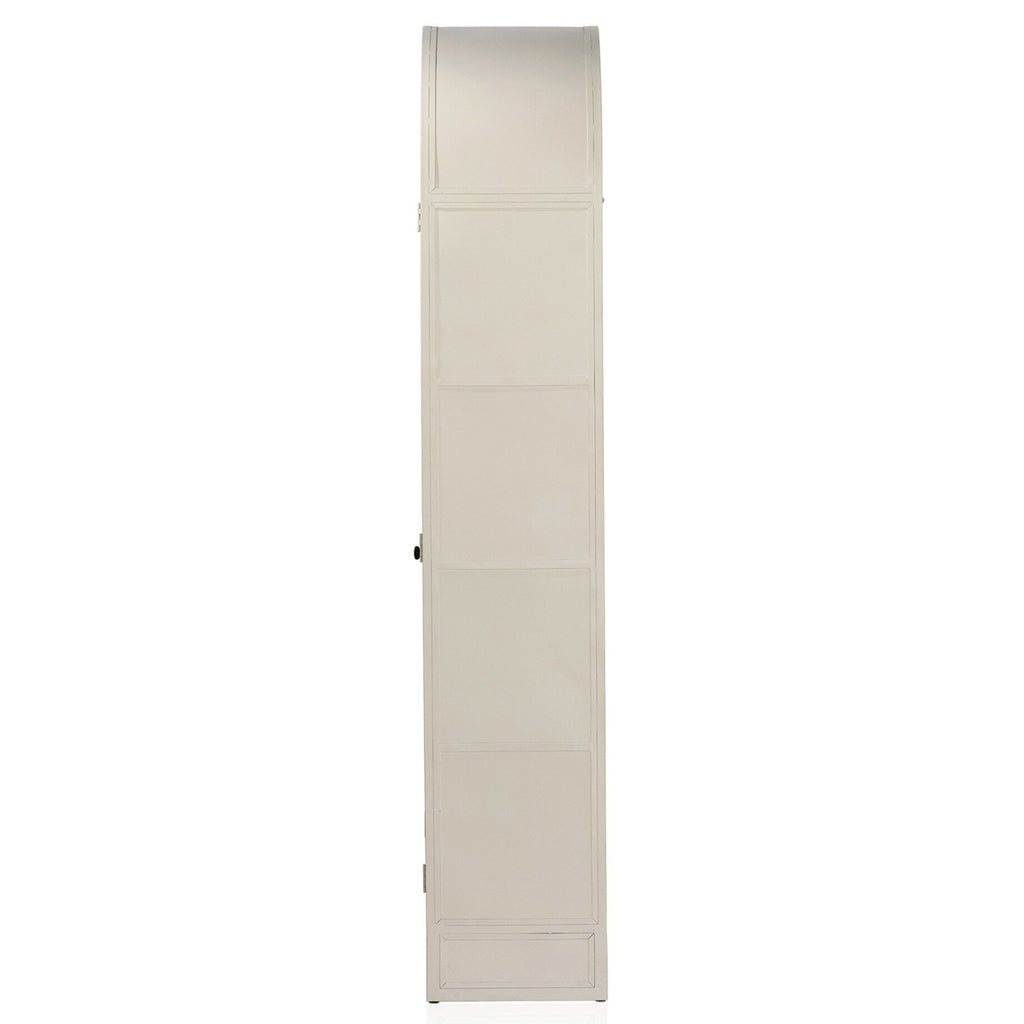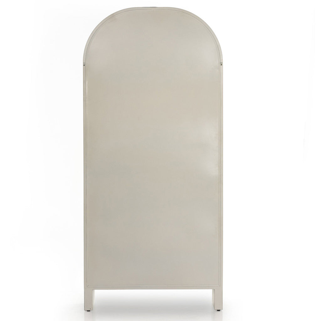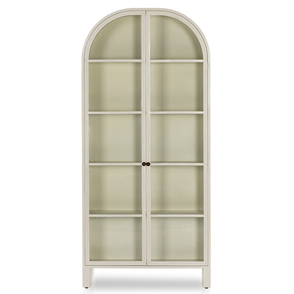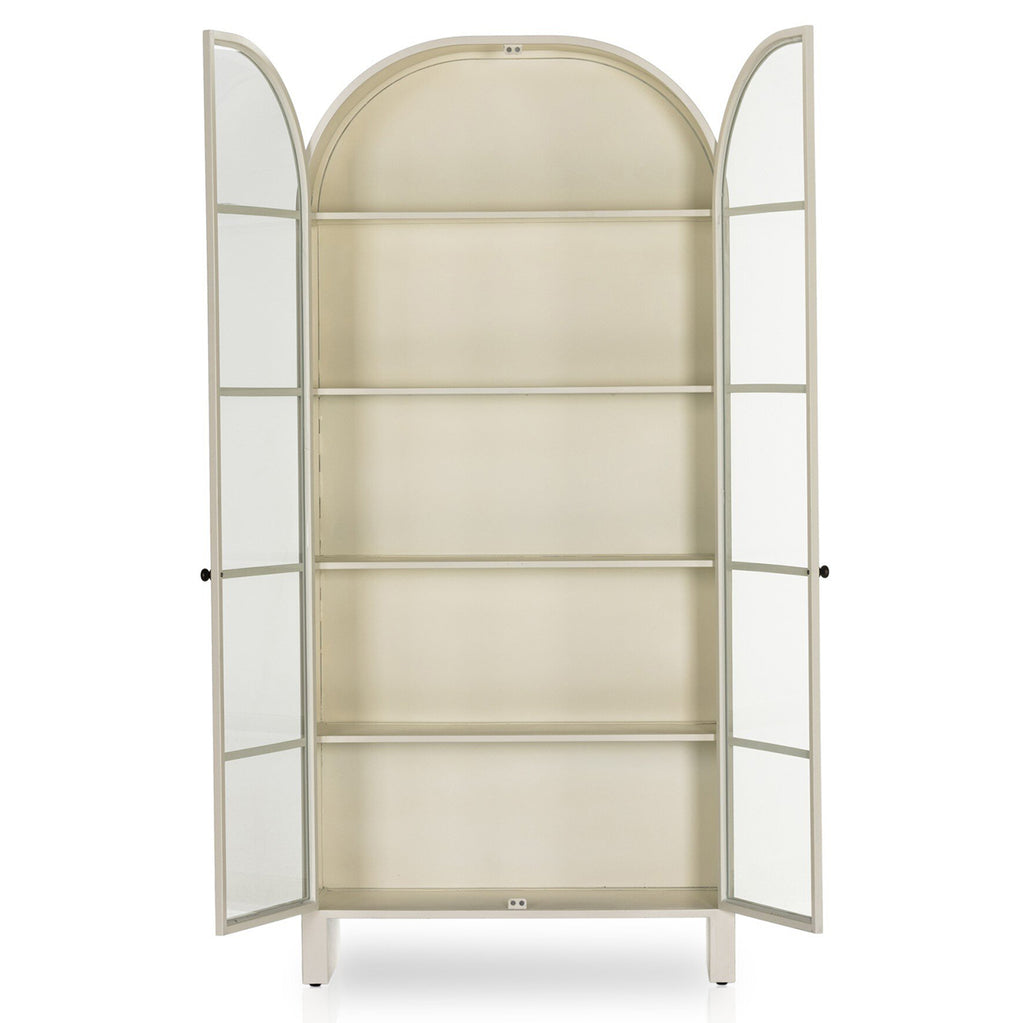 Store it in style. Made from cream powder-coated iron, beautifully arched cabinetry features glass-front doors, ideal for storing and displaying favorite books, photos, keepsakes, and more.