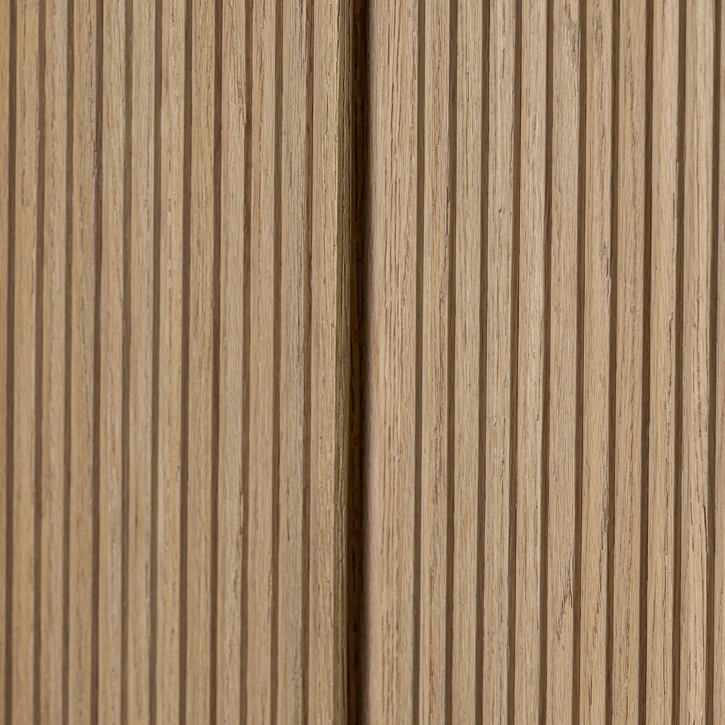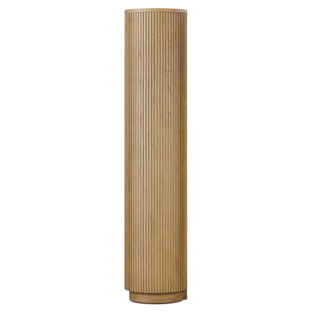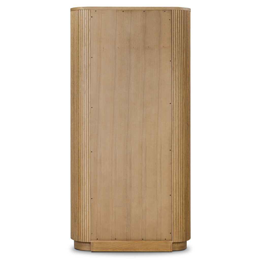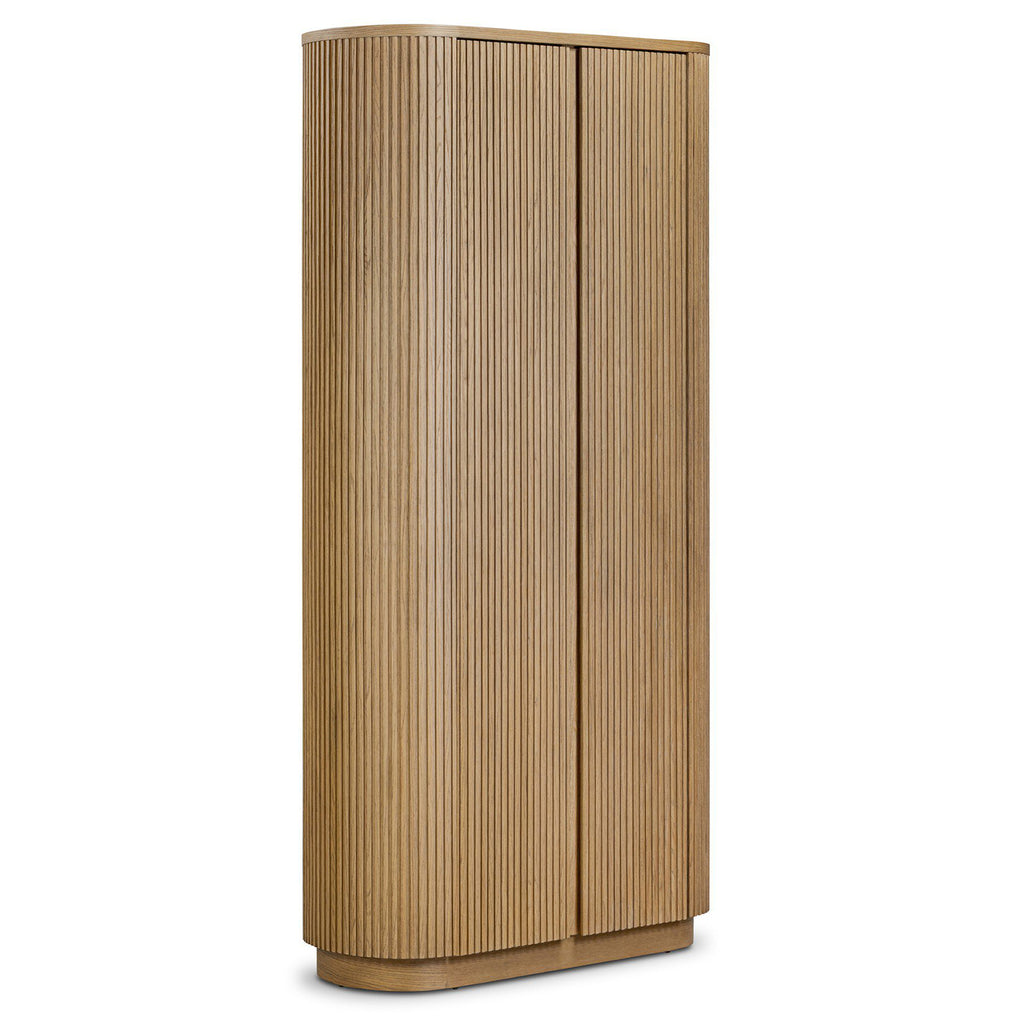 Crafted from light oak with a plinth-style base, rounded sides and linear reeding, this tall cabinet works subtle midcentury vibes into any space. Fully finished interior and shelves for quality detailing inside and out.