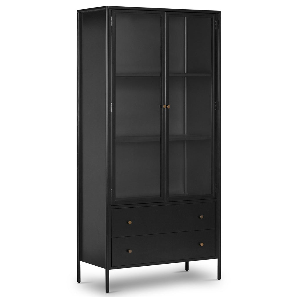 Bring a softened industrial look to the office or living room with spacious cabinetry made from black-finished iron featuring bronzed iron hardware for modernity. Glass-front doors allow endless storage and styling options, to showcase favorite books and treasures.