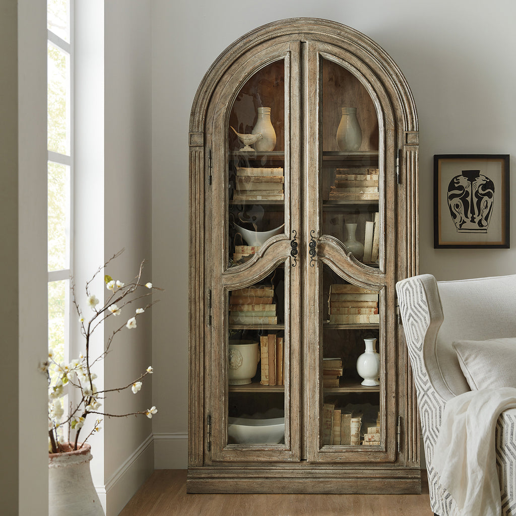 In storybook style, the romantic, softly-shaped Castella Curio exudes casual opulence and classic European design pedigree. The laid-back luxury of the sun-bathed Antique Slate finish in a beautiful patina updates the curio for today's casual lifestyles. two seeded glass doors are two top adjustable and wood-framed glass shelves with plate grooves. The center shelf is fixed, and the bottom two shelves are adjustable. Use this lovely curio alone, or bunched in twos or threes. Anti-tip hardware included.
