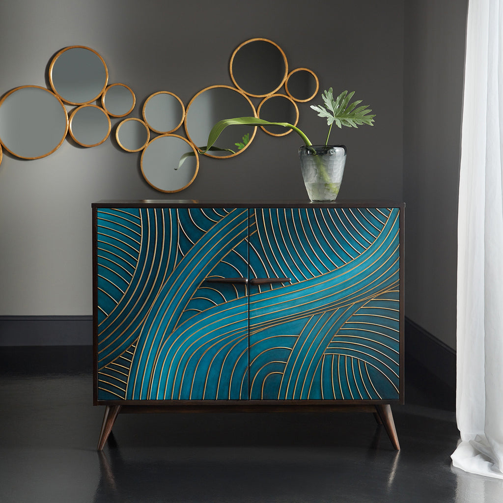 Exciting and elegant, the Esperanza Two-Door Chest is inspired by Mid-Century Modern forms, updated with a vibrant 21st Century color palette. Raised gesso teal paint is accented with gesso gold paint in a swirled pattern for tactile beauty. Crafted of Walnut Veneers with rattan, the Esperanza has one adjustable wood shelf behind each door. Back panel is the same color as the top and sides.