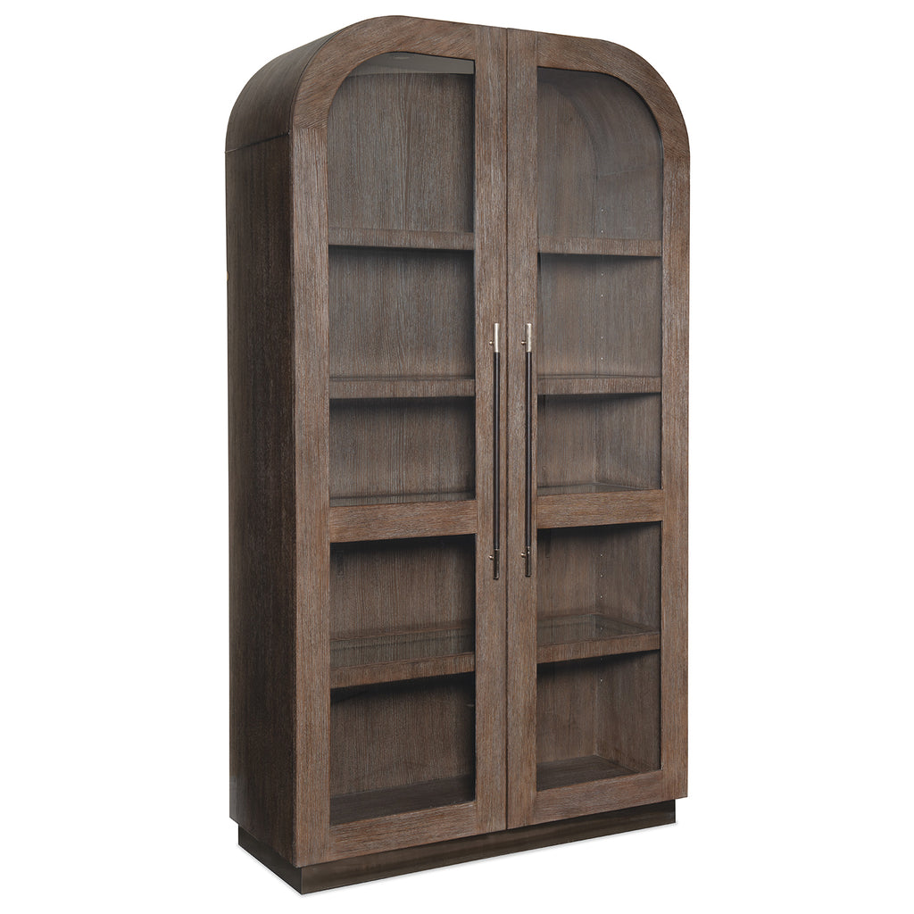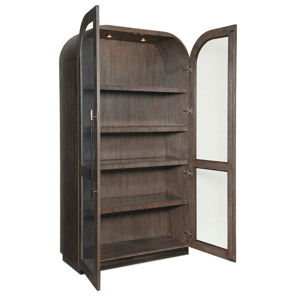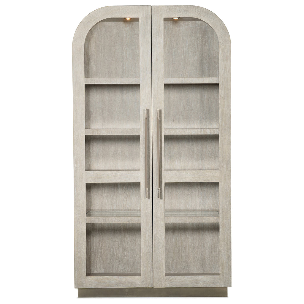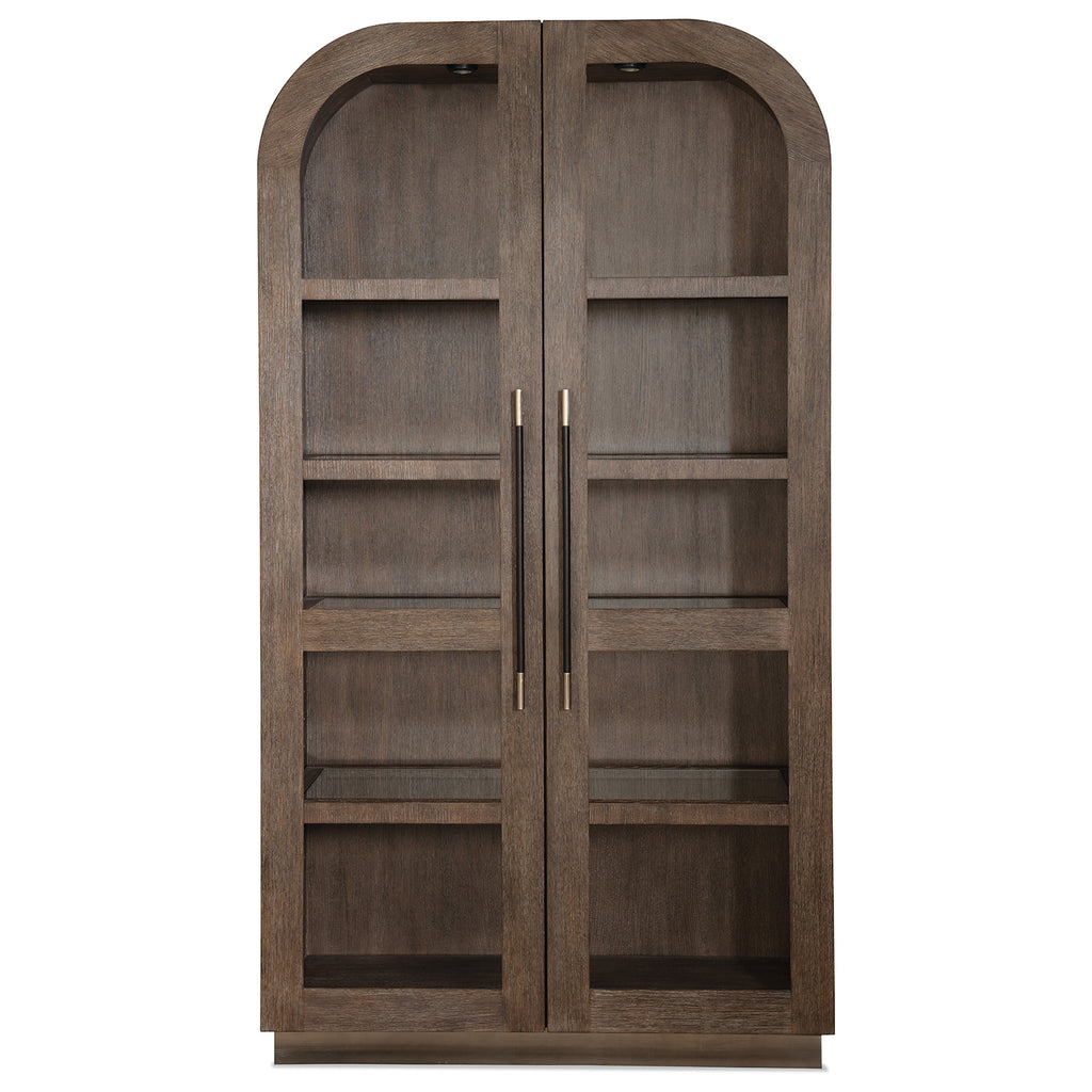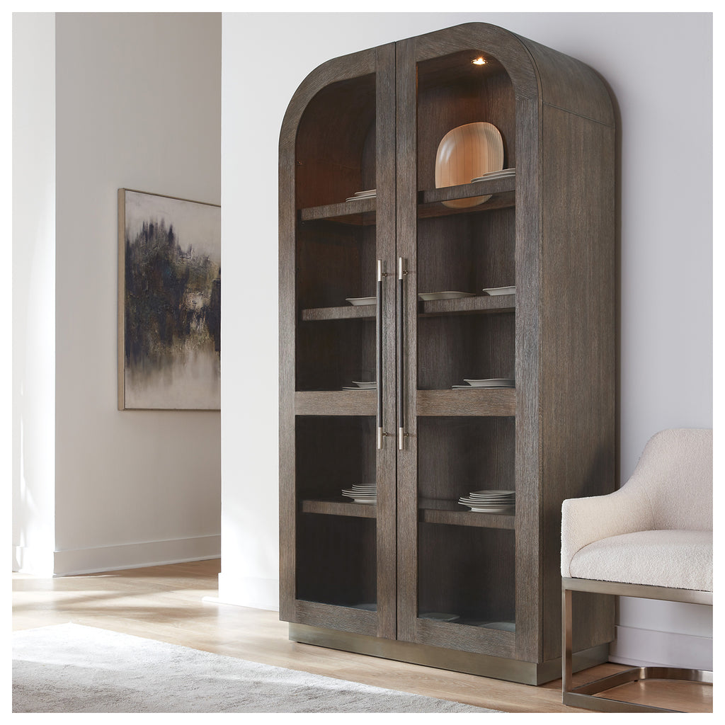 Architectural and timeless with a luxe mixture of materials, the Modern Mood Arched Display Cabinet combines Oak Veneers, Metal and Glass in a stunning statement piece. Crafted of Quartered Oak Veneers, the cabinet has two wood-framed tempered glass doors with soft-close hinges and magnetic catches. Behind the doors are two adjustable wood-framed glass shelves with plate grooves and two puck lights with a three-intensity touch switch on the right side of the back panel. The metal-wrapped base and the metal bar pulls are both in a warm pewter finish, and the bar pulls are accented with leather.