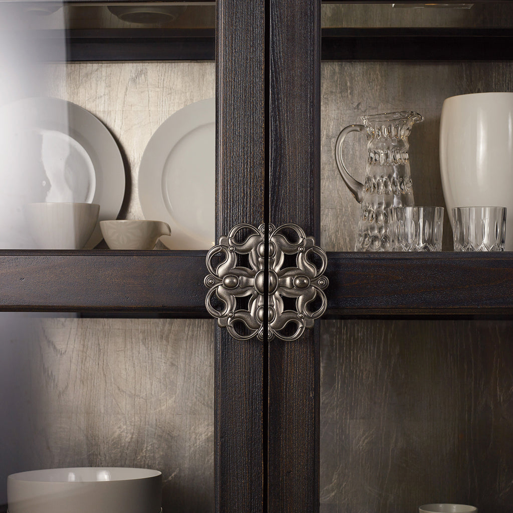 With an exotic elegant flair, the Sanctuary Curio combines a sophisticated Ebony Antiqued Oak finish with a silver back panel and is punctuated by jewelry-like medallion hardware. It features two adjustable wood-framed glass shelves with plate groove, one adjustable wood shelf and one fixed wood shelf and a touch light to illuminate your collectibles. Use alone or bunch.