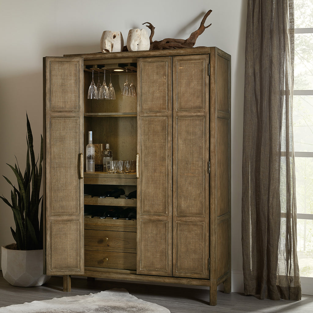 Escape the stress and extend hospitality to others with the resort-inspired Sundance Bar Cabinet, featuring two bi-fold rattan doors, four drawers with self-closing drawer guides, two pull-out work surfaces, four pull-out wine shelves and eight stemware racks. Crafted of Pecan Veneers, Rattan and glass, the bar cabinet is finished in Cliffside, a rich, dynamic brown finish with light burnishing on the edges. Lights are activated by a three-intensity touch switch.