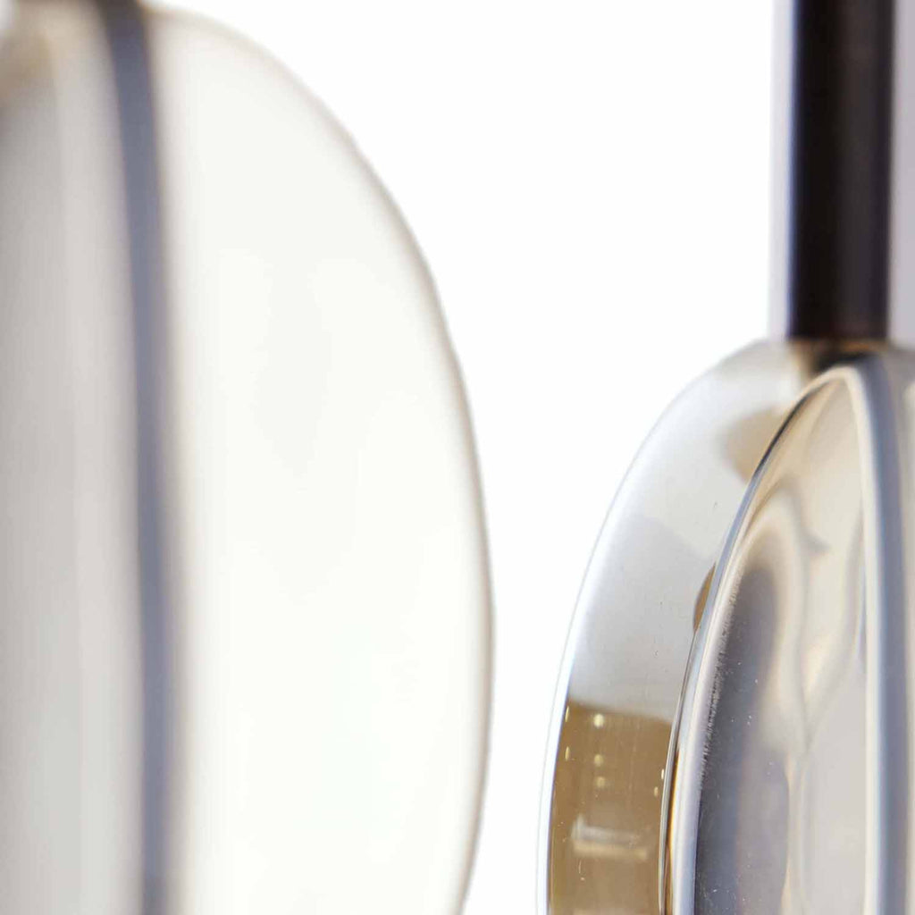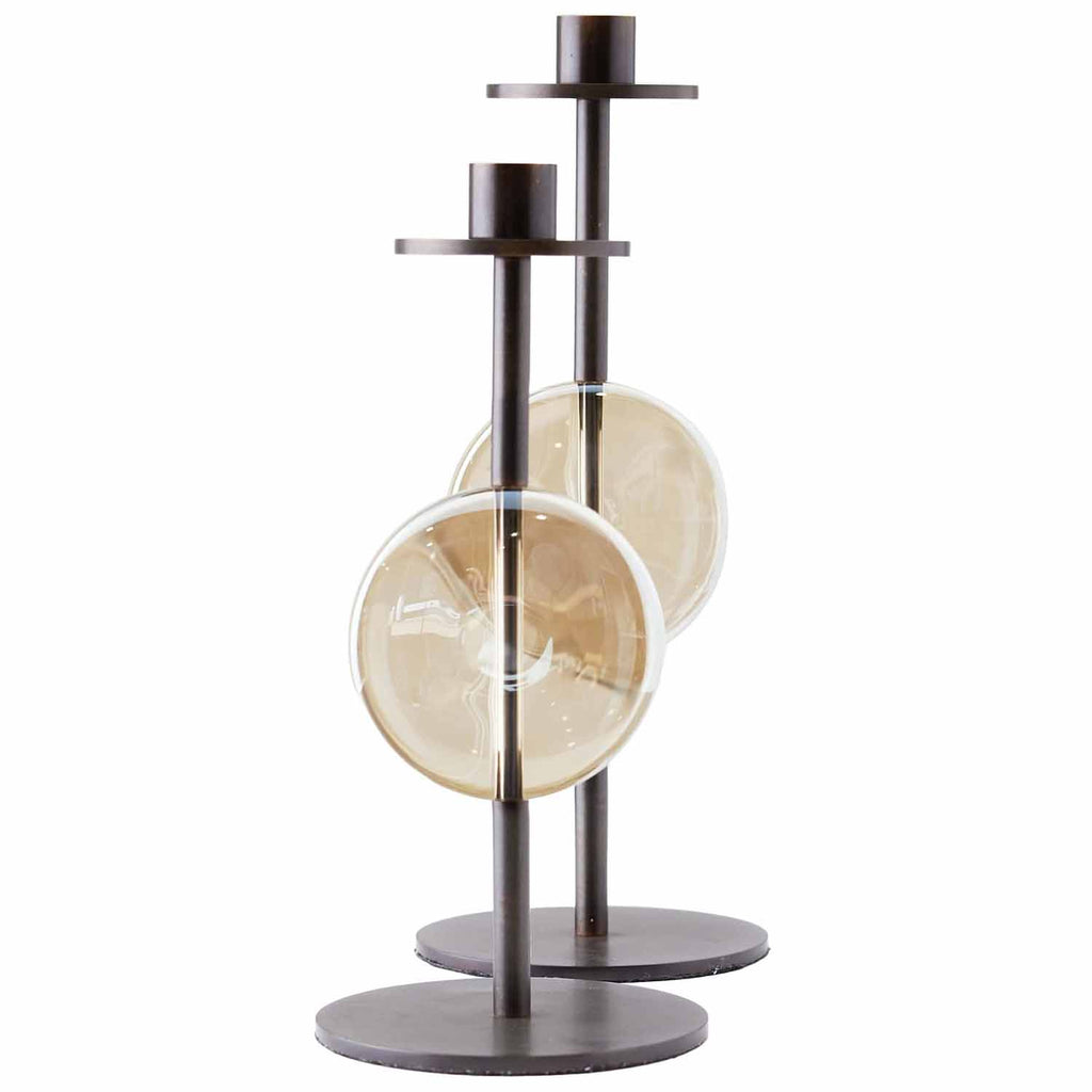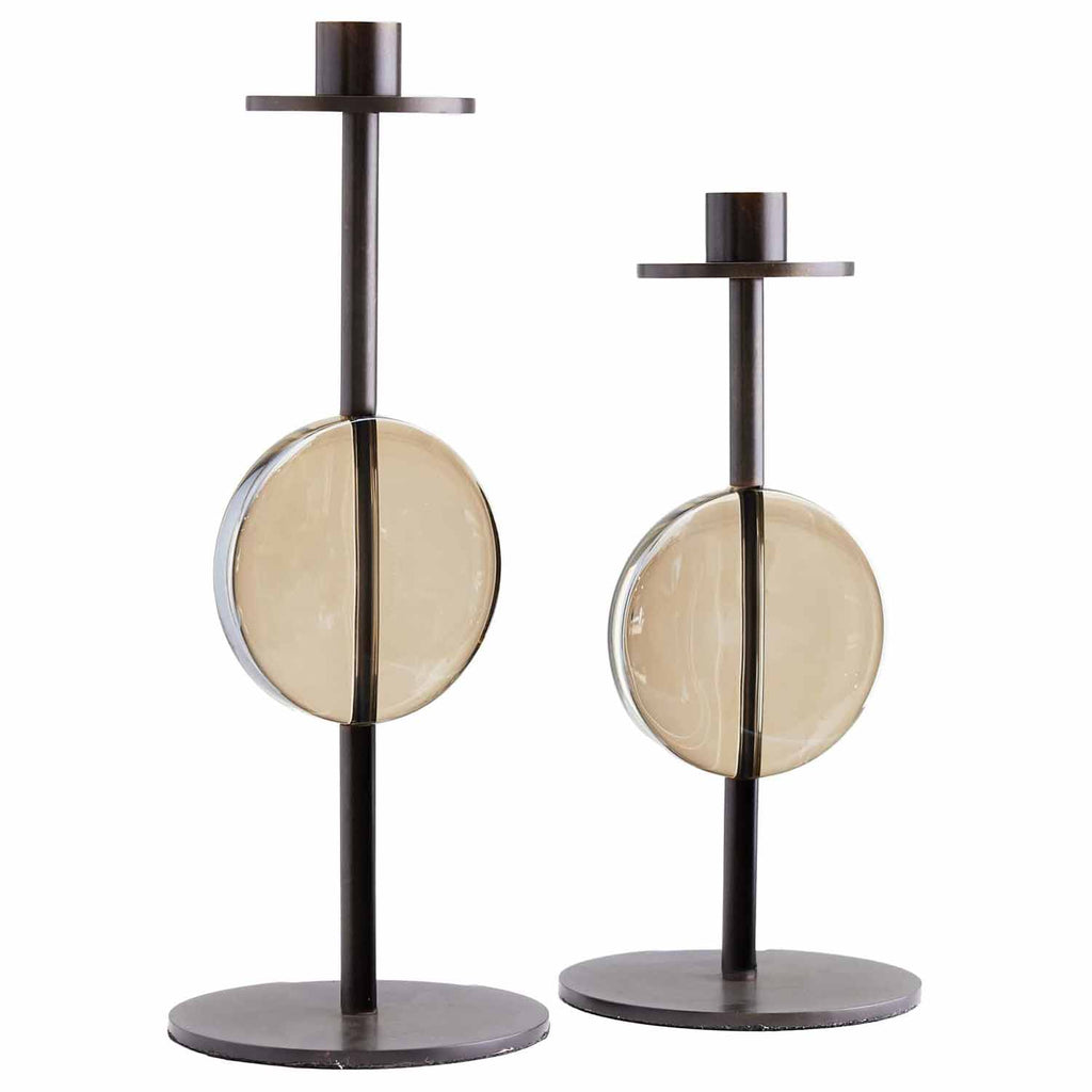 Moody and modern, this pair of candleholders feature discs of champagne crystal suspended amid bronze-finished steel stems and round bases. Top any surface with the mixed-media taper-holders for a soft layer of illumination.