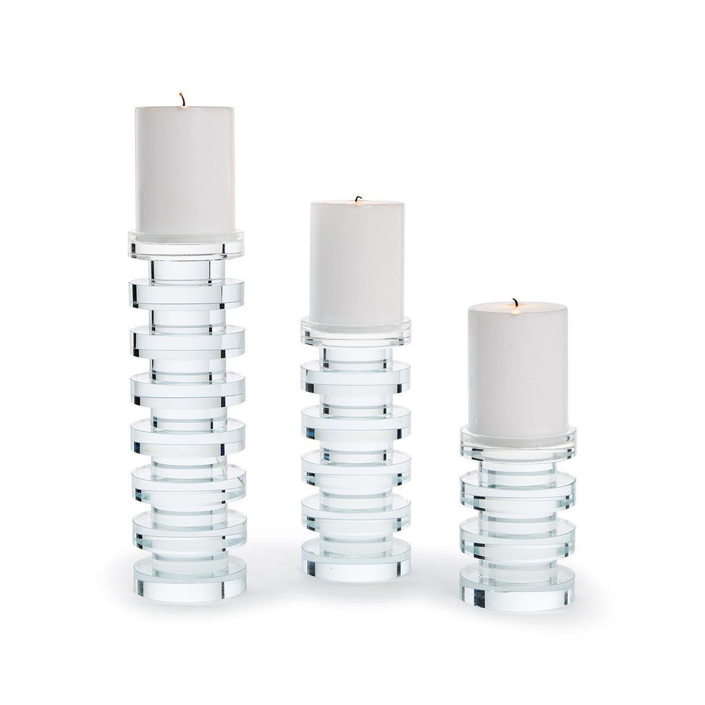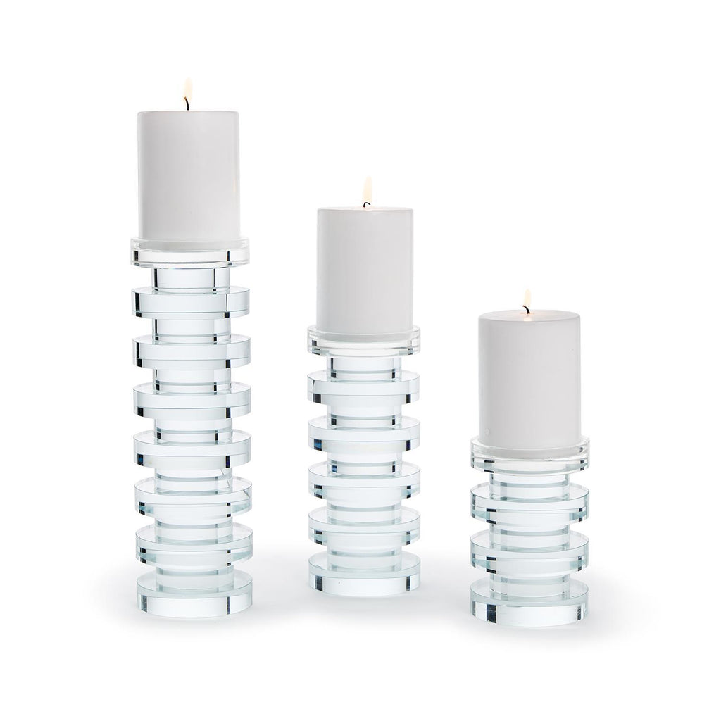 Illuminate your living space with the aureole candle holders. Crafted from crystal clear glass, this set of exquisite holders stand at 5 1/4in, 8 1/4in, and 11 1/4in tall, adding a touch of elegance to any room. Handmade with precision, each piece exudes sophistication and charm.