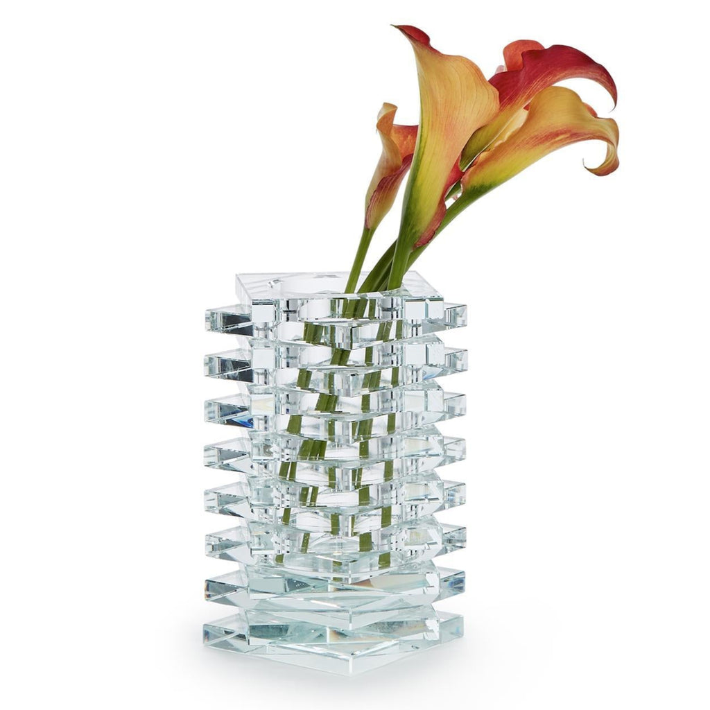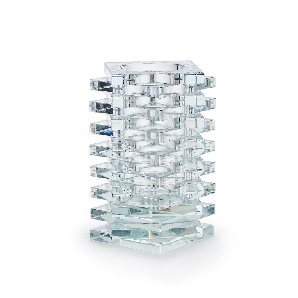 Elevate your space with the squarely stacked crystal pillar candle holder. The clear glass design exudes elegance and sophistication, making it a perfect accent piece for your mantelpiece or dining table. Handcrafted with precision, this stunning candle holder stands 7 1/2 inches tall showcasing its impeccable craftsmanship.