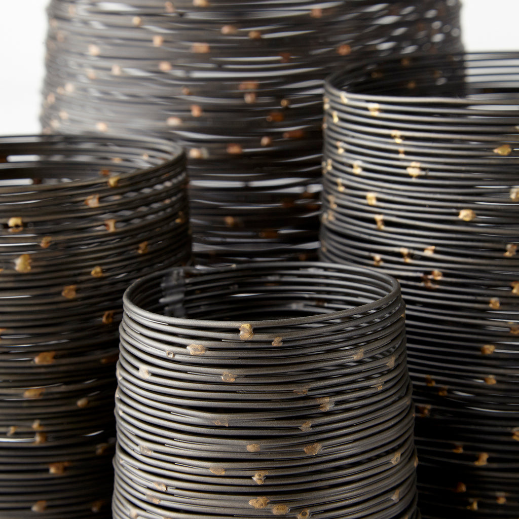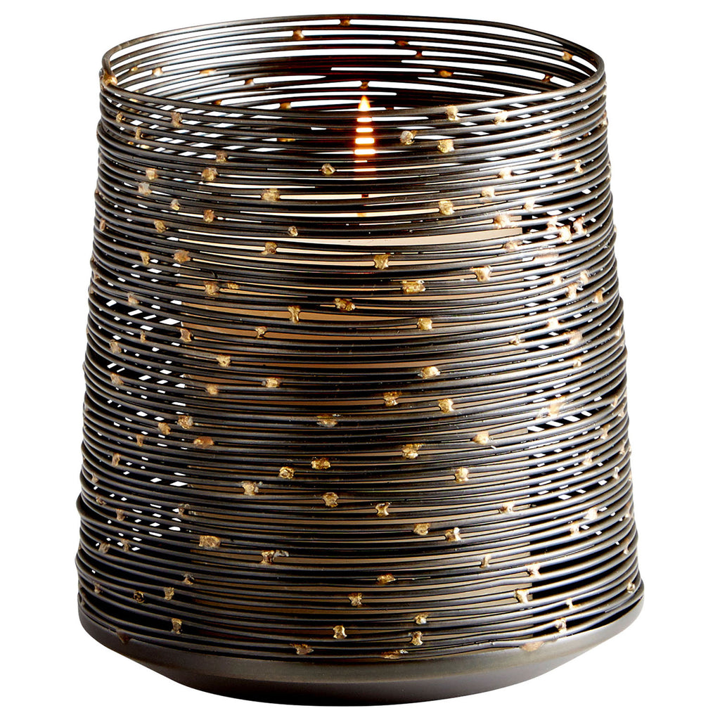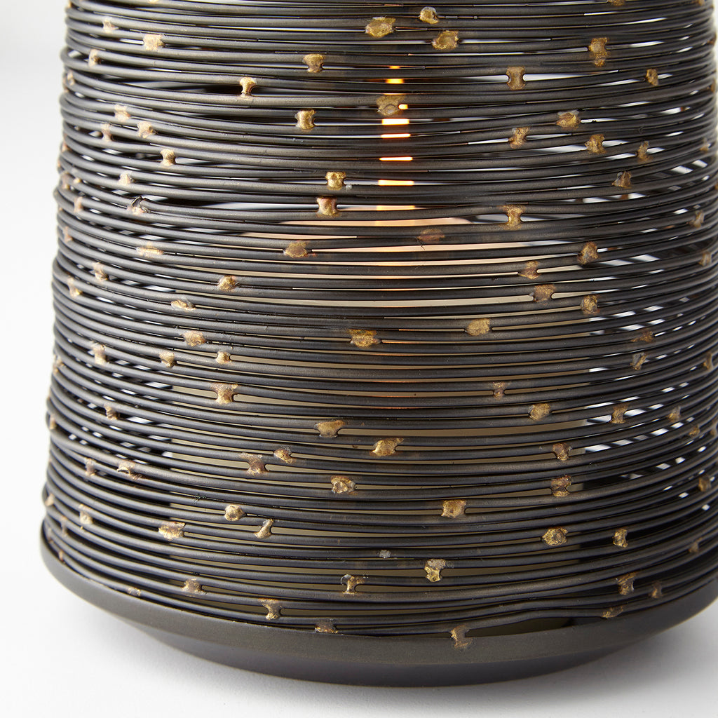 Wire-like bands circle this exceptional metal candleholder to provide a stylish glow from within. In an antique black finish, this medium holder is a charming addition to a living room mantel or end table.