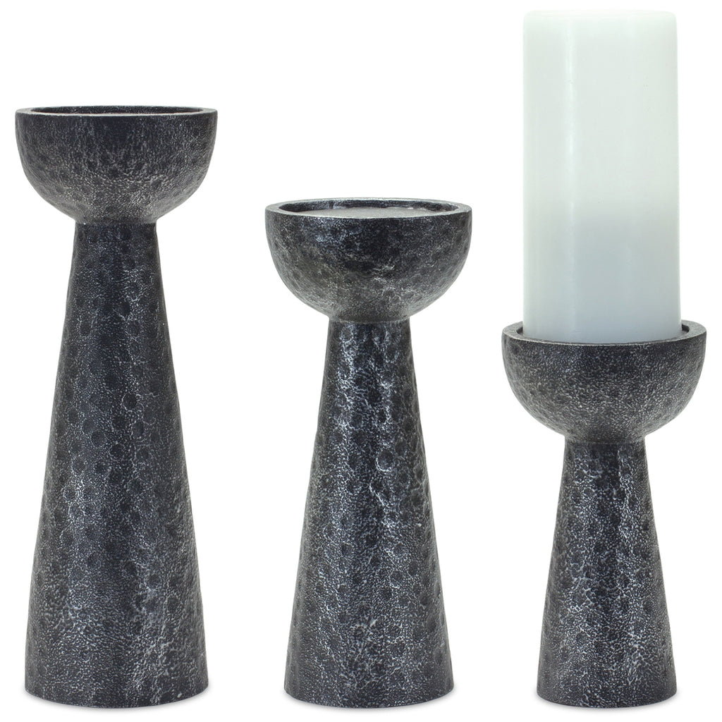 Decorate your home with this beautiful set of Decorative Candle Holders. The hammered design paired with the classic black finish makes this set the perfect addition to any style of decor. The quality polyresin composition is sure to last for seasons to come. Illuminate the piece with real wax or LED candles. Candles sold separately.