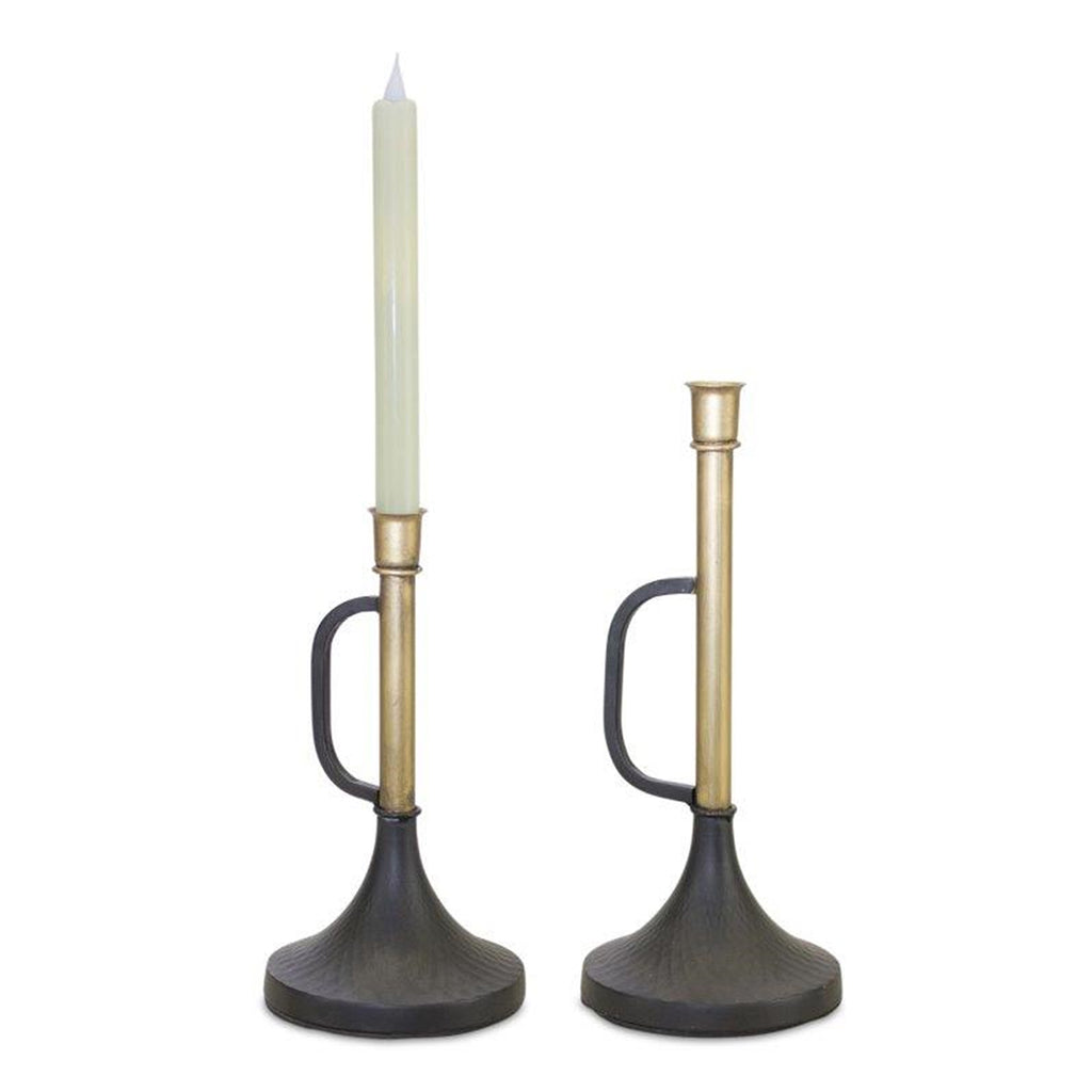 Add a touch of sophistication to your home with this stunning set of Taper Candle Holders. Featuring two assorted sizes, this set is a great fit for your contemporary or modern style of décor. The chic black and gold tones paired with the traditional trumpet shape and handle accent are perfect to create a memorable display. The quality metal composition is sure to endure for seasons to come. Display the pieces on your mantle or bookshelf to make a statement. Add a pair of taper candles to the set to complete the look!