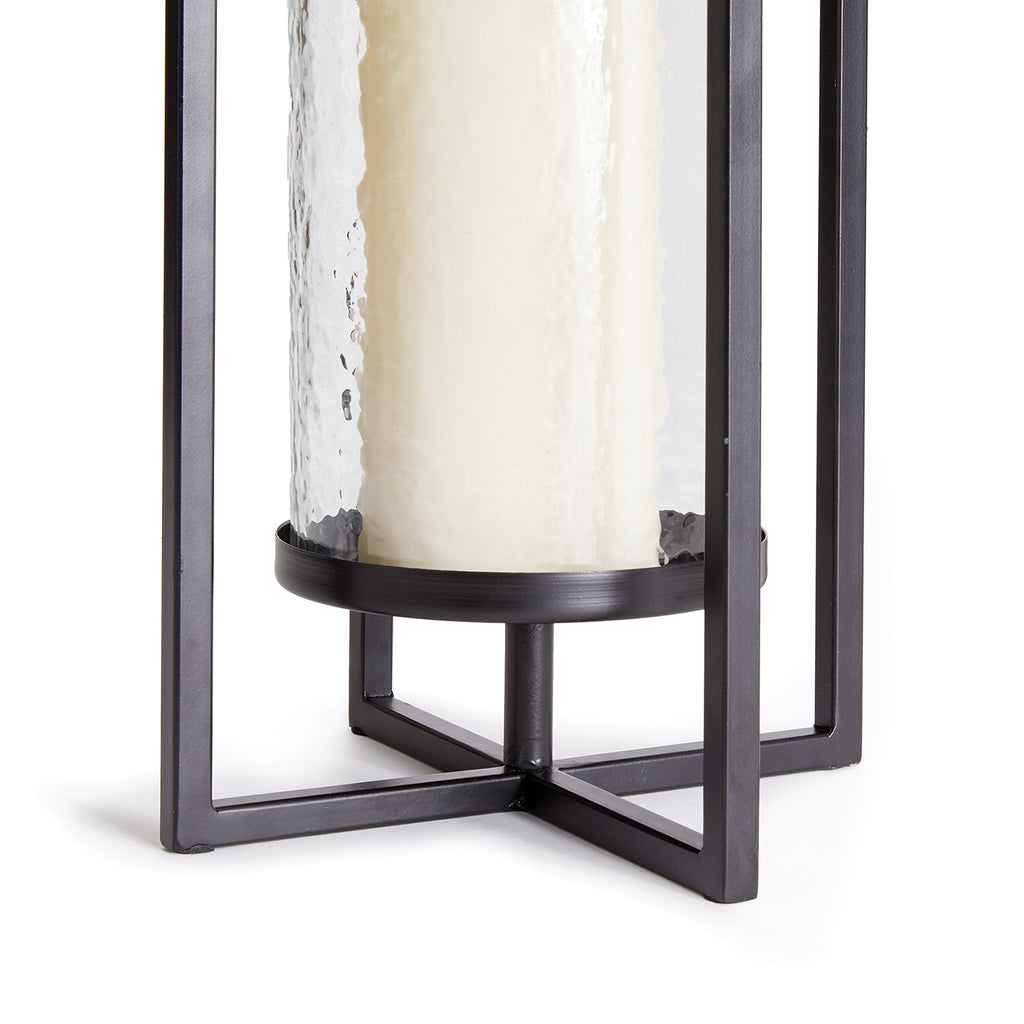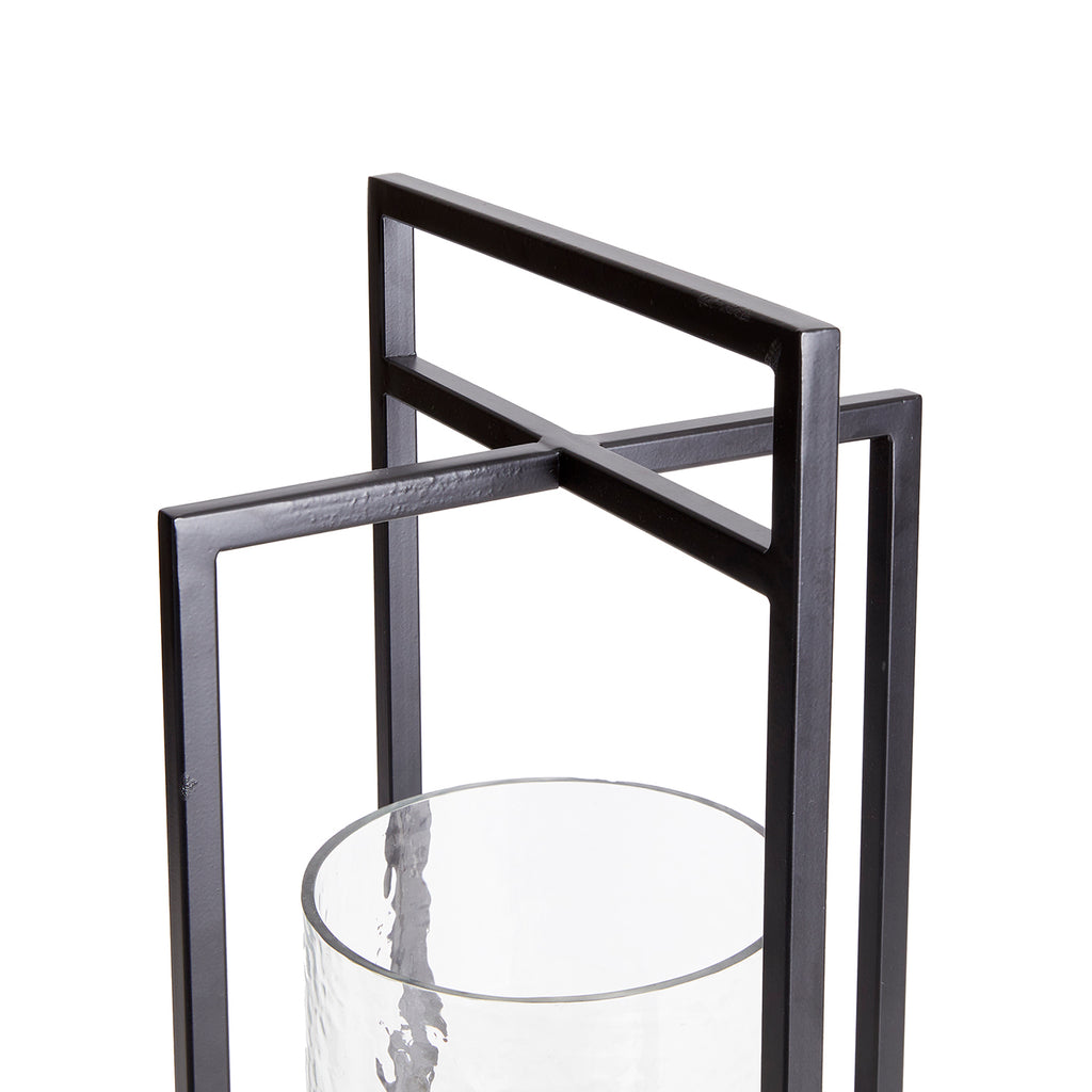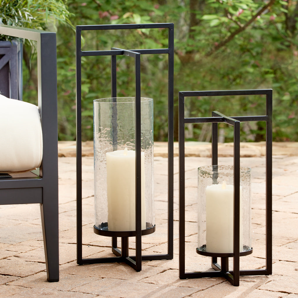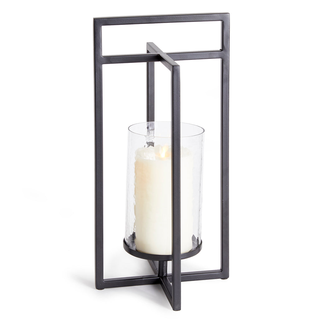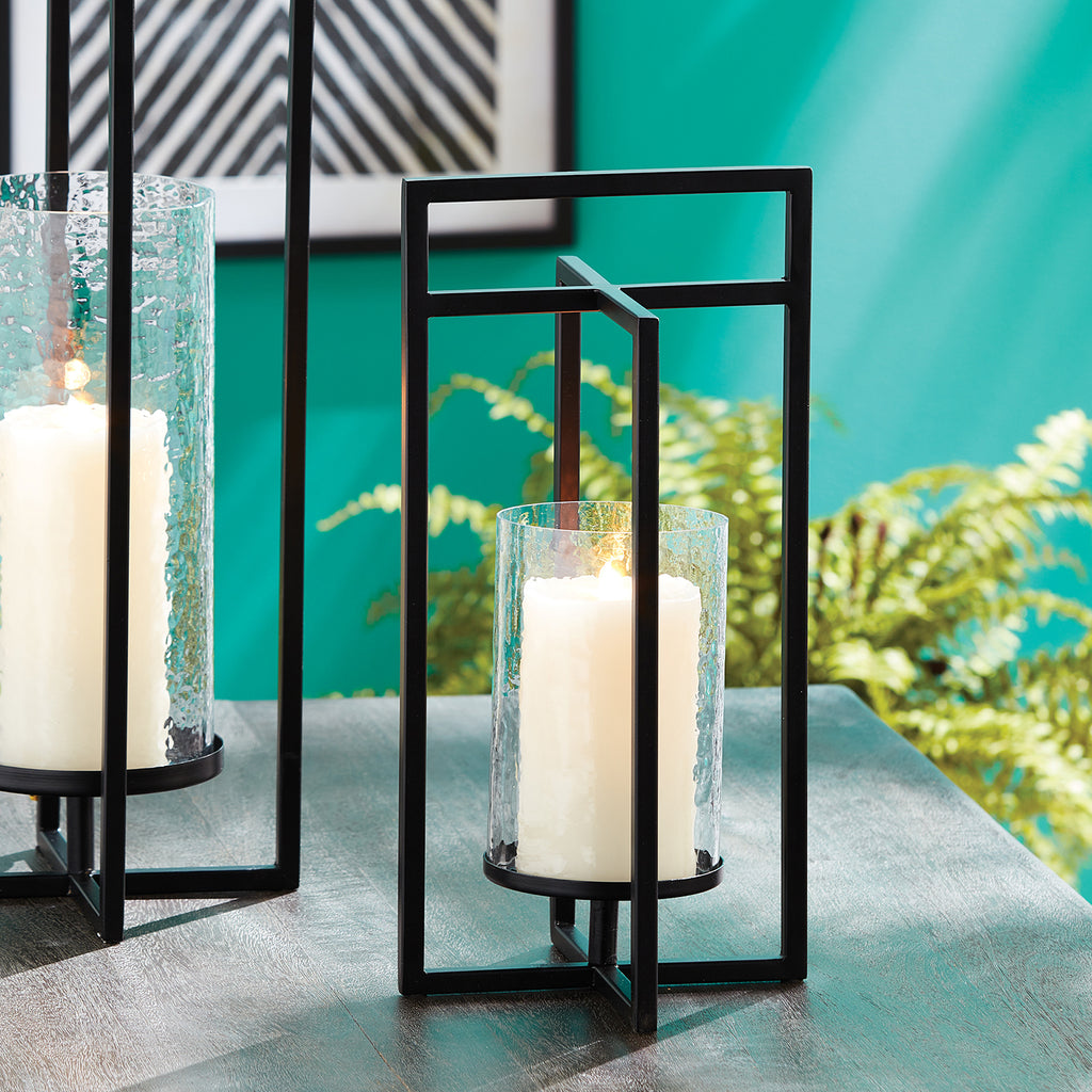 Mondrian-inspired, simple geometric shapes with intersecting planes make for a contemporary look. This indoor lantern is tailor-made for the cool, modern space.