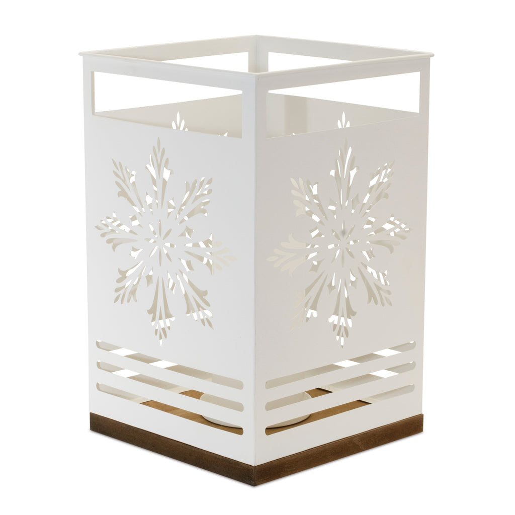 Illuminate your home this holiday season with this stunning set of Snowflake Candle Holders. Featuring two assorted sizes, this set is a great fit for your traditional or woodland style of holiday decor. The cut-out metal snowflake design paired with the natural wood base accent is the perfect combination to create a memorable display. The quality iron metal and MDF wood composition is sure to endure for seasons to come. Illuminate the set by adding a real wax or LED candle to each holder. Candles sold separately, this set best fits a 3in or 4in pillar candle.