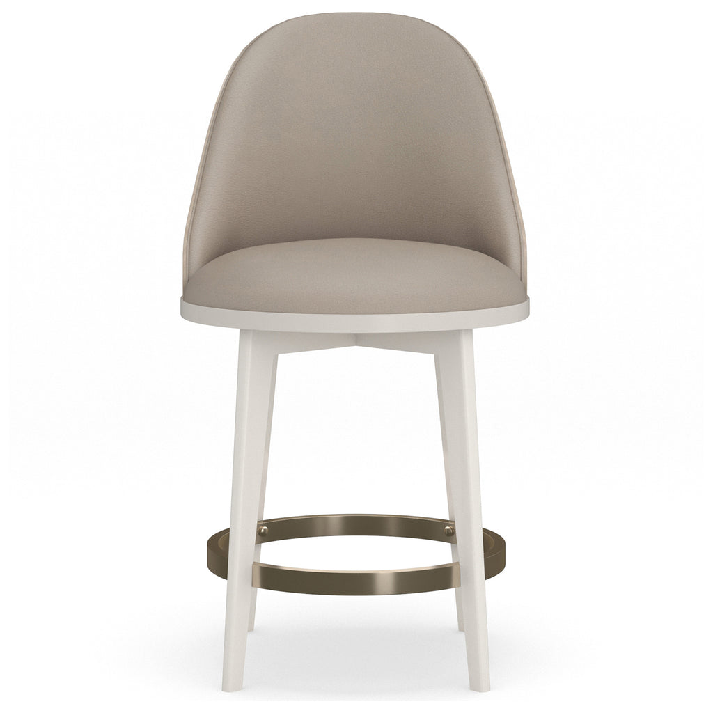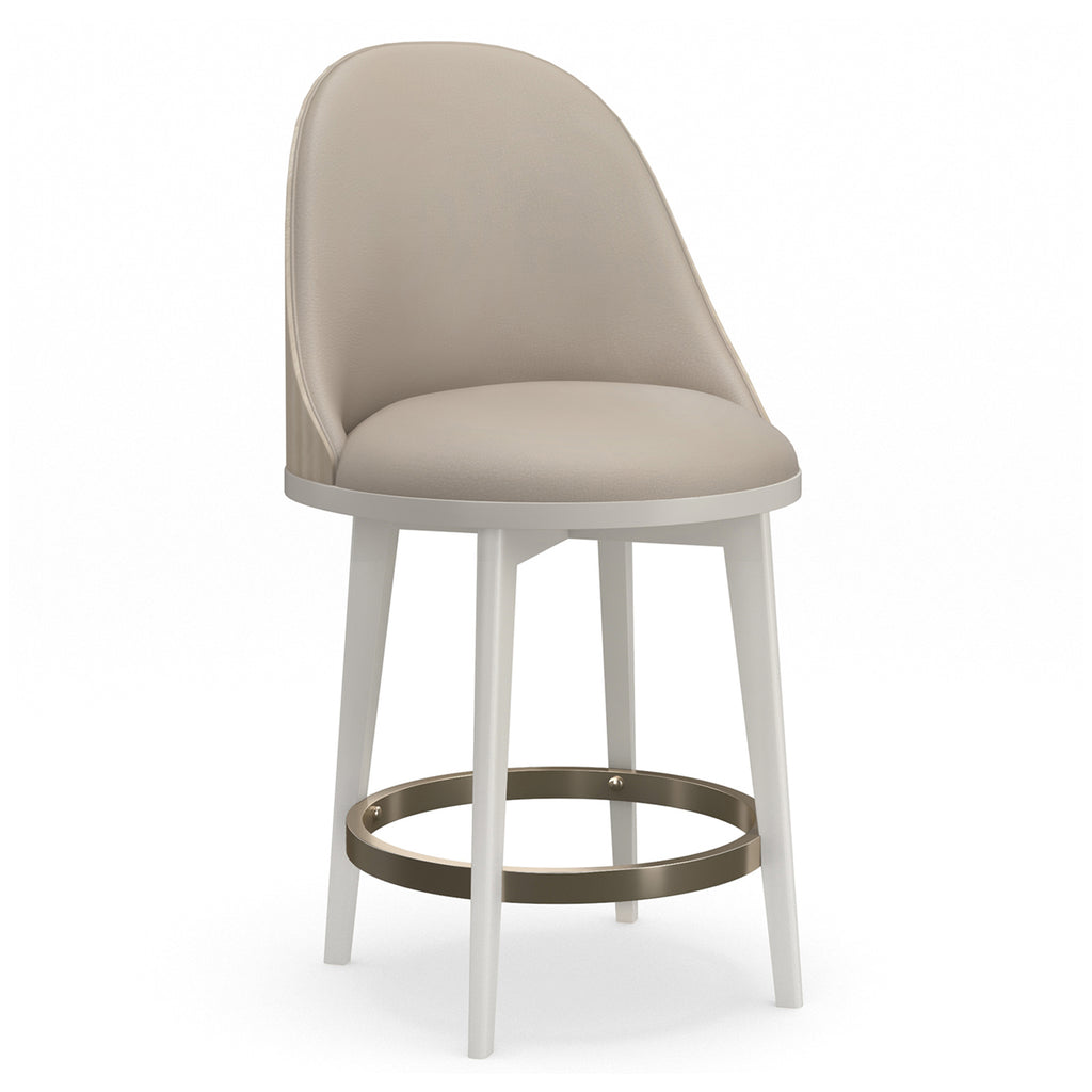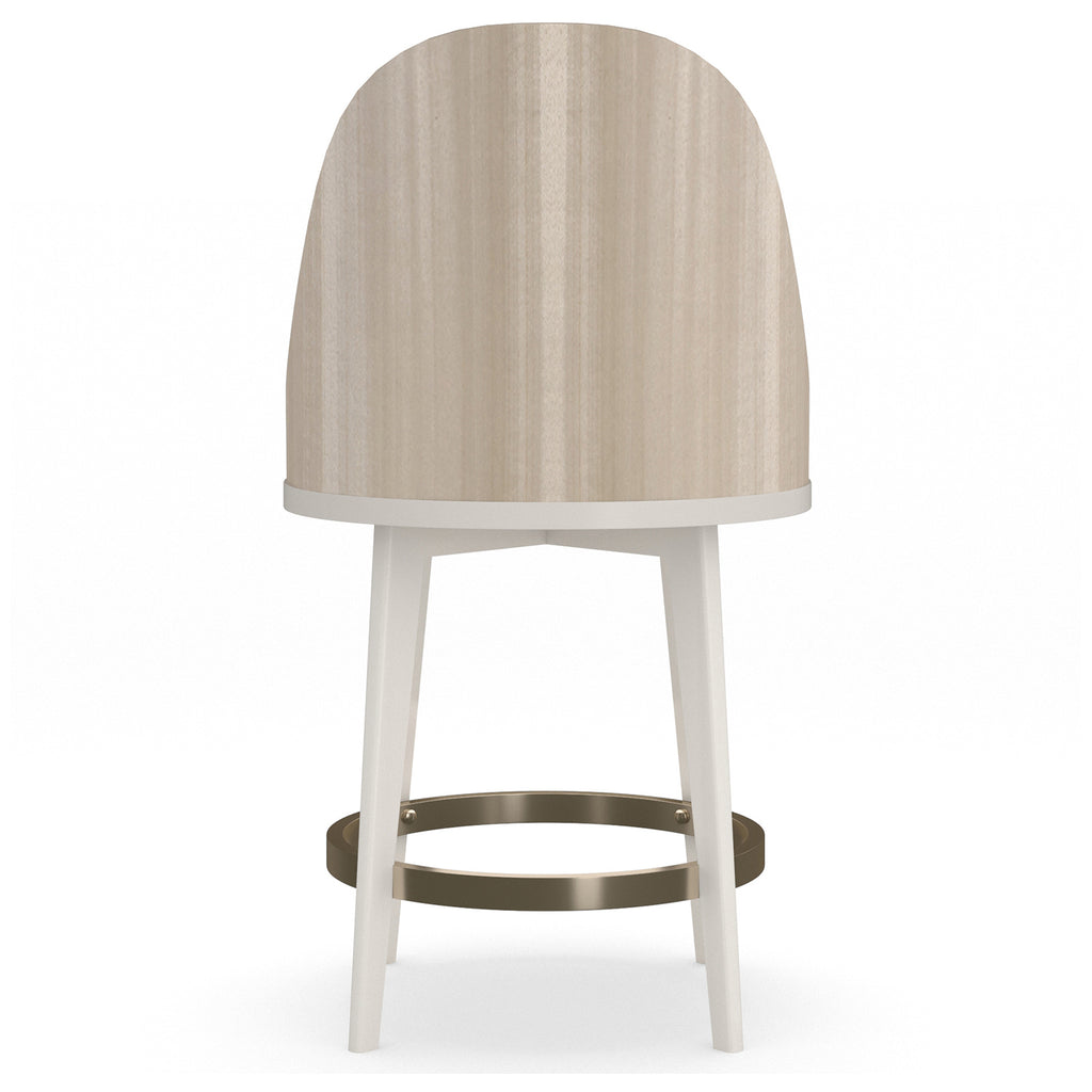Luxuriously dressed an Ivory shimmer woven fabric, this modern counter stool is the perfect height for a breakfast counter or bar. It features a comfortably curved wooden back glowing Moonstone. The round tapered legs are dressed in Almond White paint. A metal hoop in Champagne Gold, set at just the right height for getting in and out, adds shimmer and gives leverage to swivel with ease.