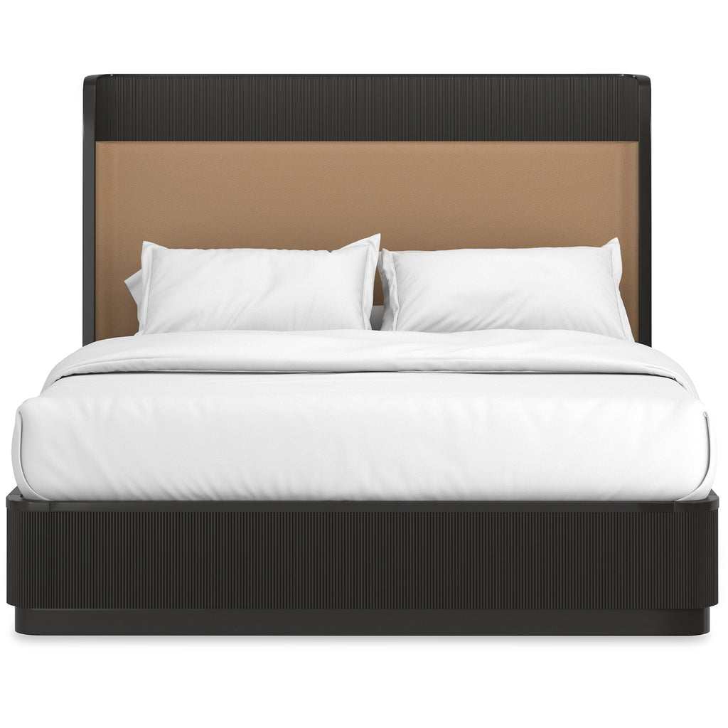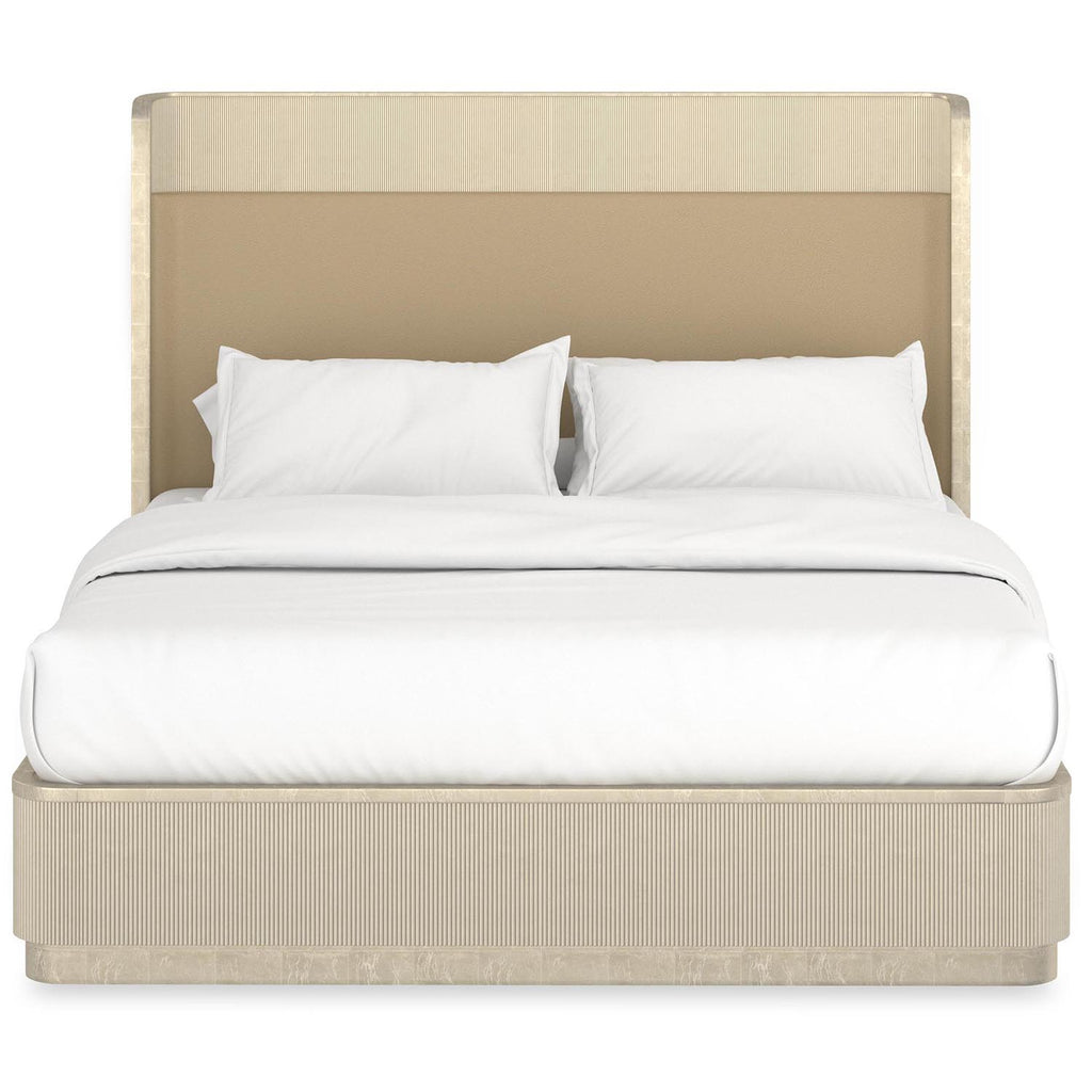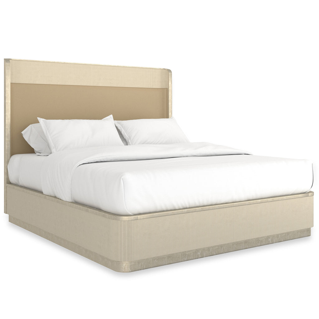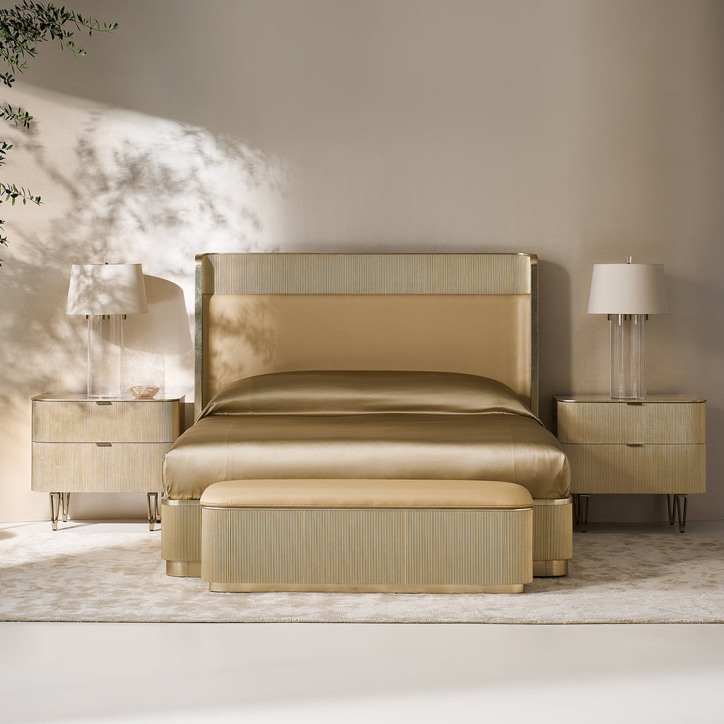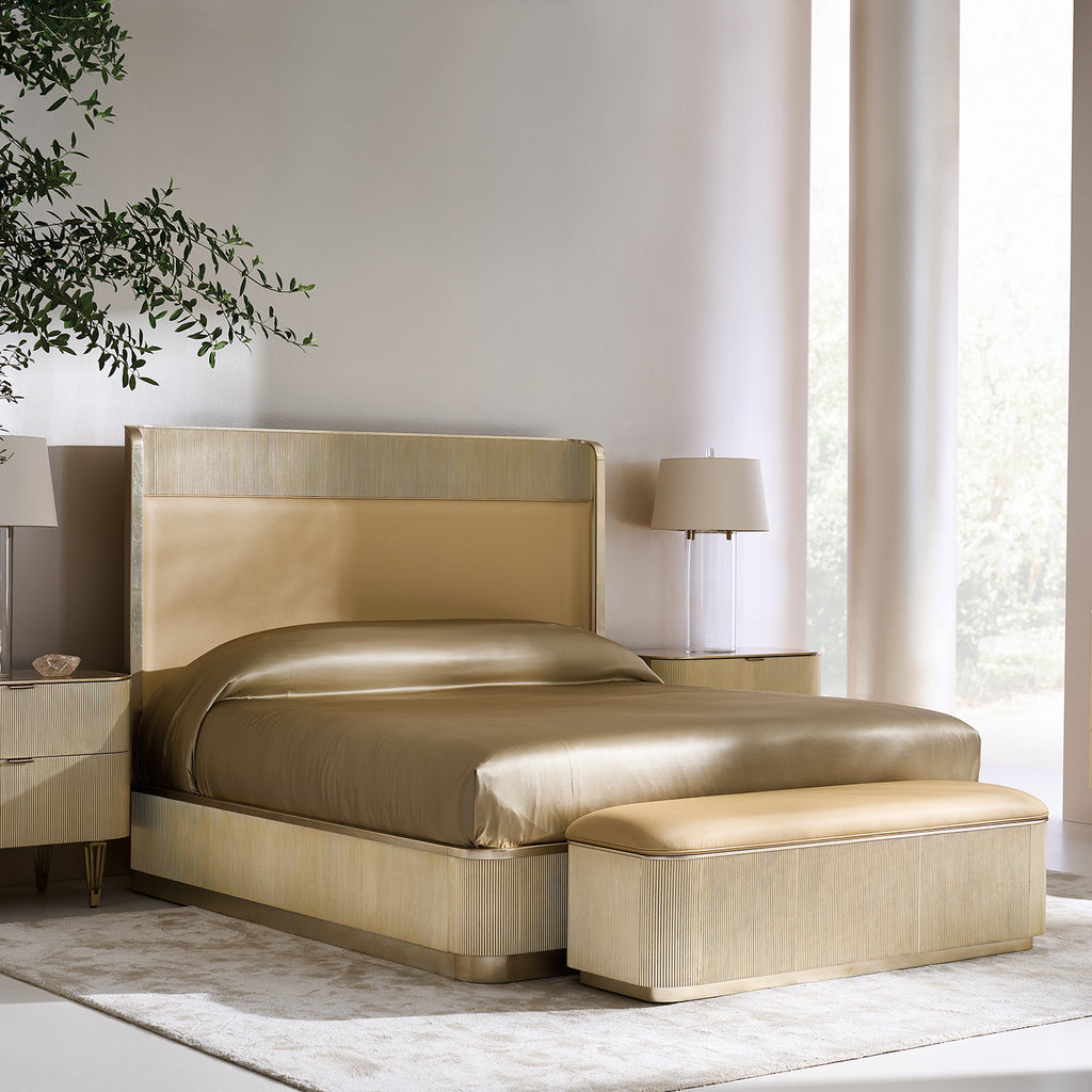 For a beguiling interpretation of our softly curved platform bed, “Fall in Love” combines a thoughtful mix of luxe materials. The reeded headboard, footboard, side rails and plinth base are shimmering Oracle. The headboard is upholstered with an inset of sumptuous material that has the look of silk. Whisper of gold metal trim adds an appropriate touch of glamour. Understated yet exceptional, this beloved bed will make all your champagne wishes come true.