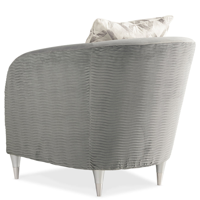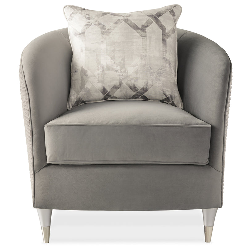 Soft curves converge with flowing lines to create an enveloping silhouette. Features a plush seat and smooth upholstered back, dramatically defined by pleated velvet that wraps the frame with a rippling effect. A metallic pillow adds an artful accent, complemented by tapered round legs with polished ferrules. Pair with our matching Caracole Farrah sofa, or create a cozy bedroom corner.