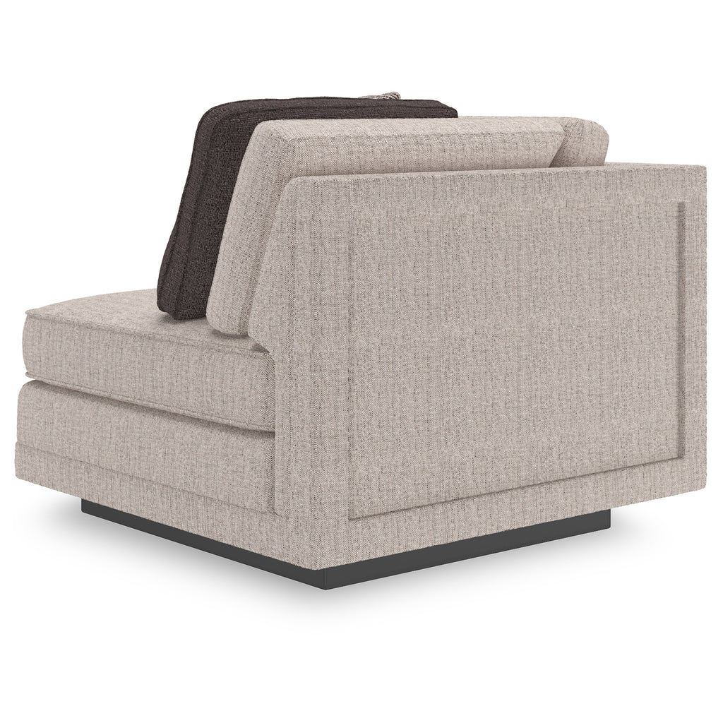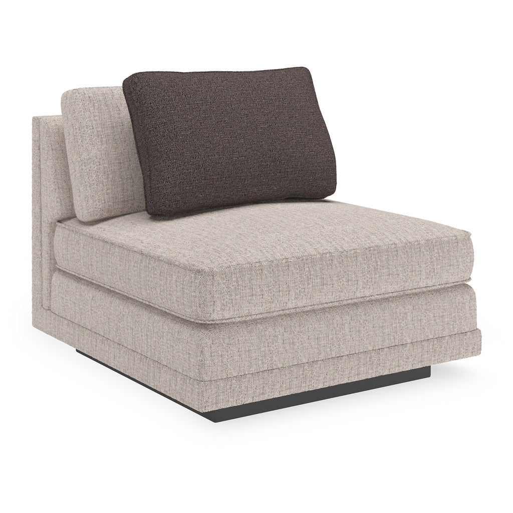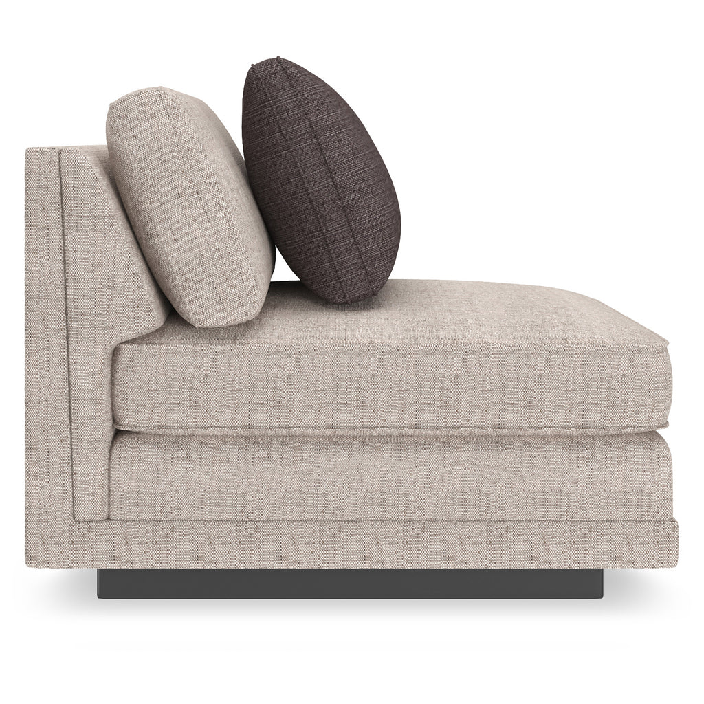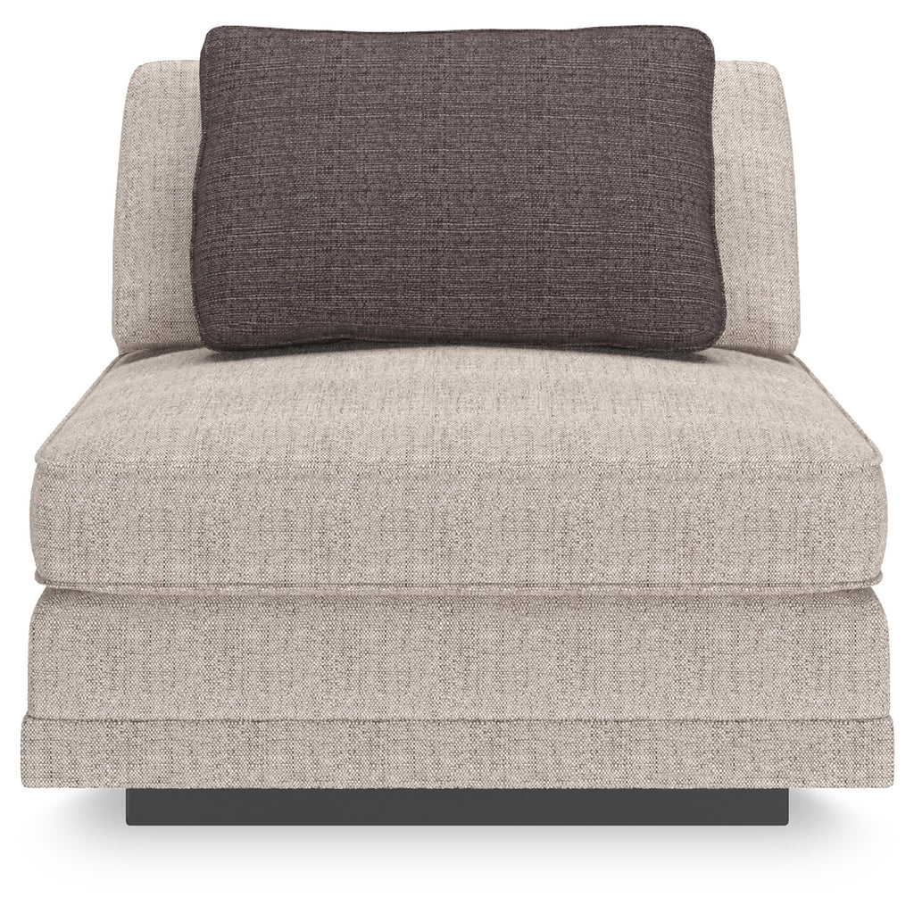 This fully upholstered armless chair is designed to pair with the Fusion corner unit to create the configuration you need for your living space. Perfectly sized and deeply comfortable, it’s tailored to perfection in an Oatmeal woven slub. The seat and back pillow use Blendown so you sink into their softness. One down accent pillow is covered with a chunky ivory/black/brown tweed the other is covered in Mink velvet. A cut-out boxing design around the outside back and a recessed wood plinth base in Simply Black complete this piece’s distinctive aesthetic style.