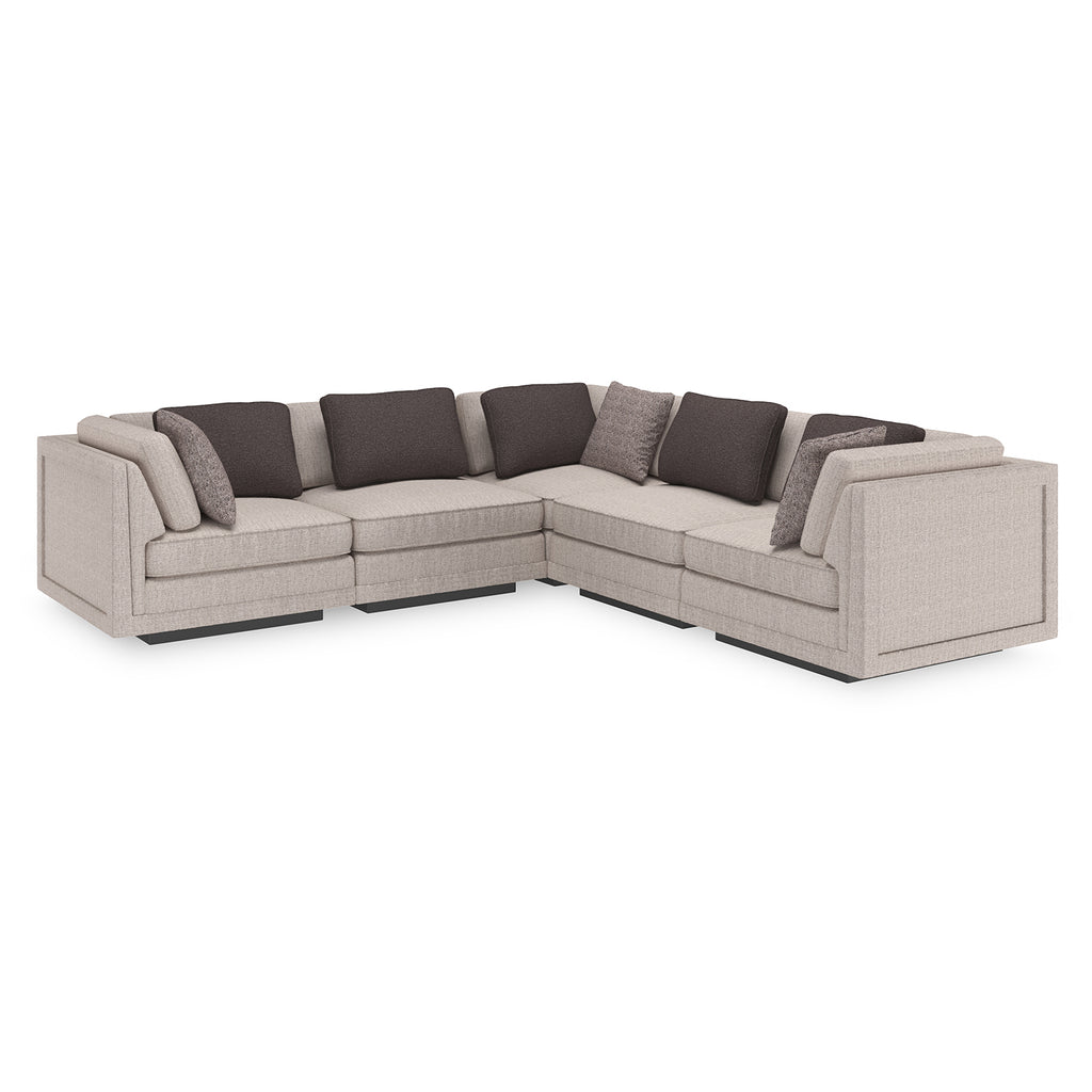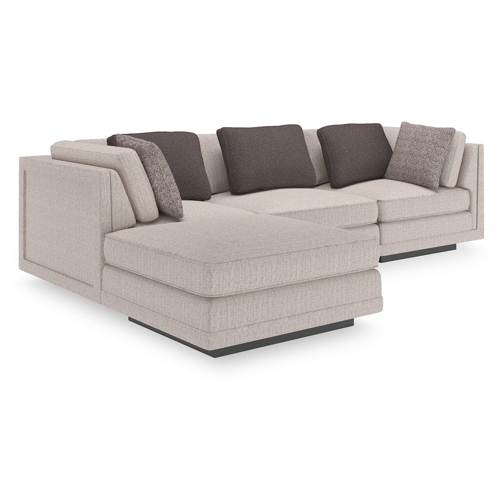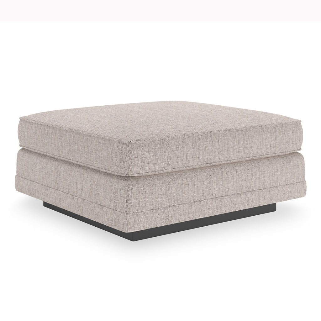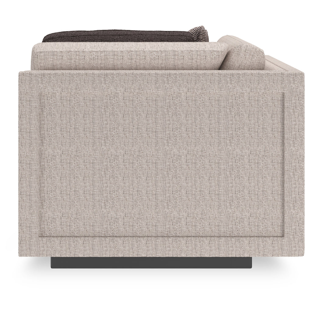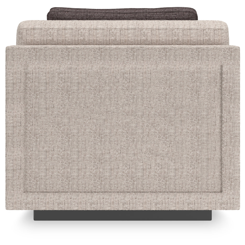 This fully upholstered armless chair is designed to pair with the Fusion corner unit to create the configuration you need for your living space. Perfectly sized and deeply comfortable, it’s tailored to perfection in an Oatmeal woven slub. The seat and back pillow use Blendown so you sink into their softness. One down accent pillow is covered with a chunky ivory/black/brown tweed the other is covered in Mink velvet. A cut-out boxing design around the outside back and a recessed wood plinth base in Simply Black complete this piece’s distinctive aesthetic style.