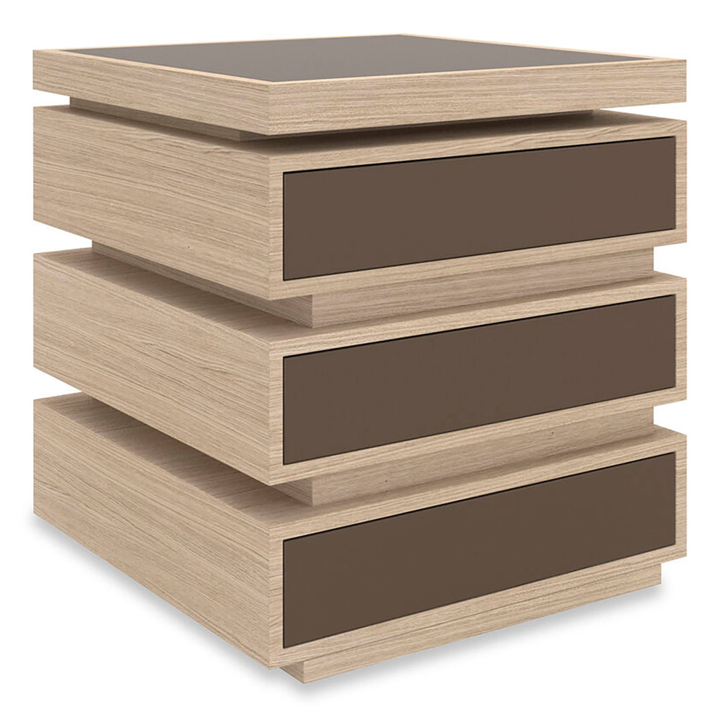 Perfectly sized as an end table, the architectural offset stacking of mixed materials makes this look memorable. The top frame showcases Koto wood finished in Dry Martini and inset with Smoked Bronze mirrored glass. The table tiers are Koto in Dry Martini with a Neutral Metallic finish. Two soft-close drawers are fronted with bronze mirrors. Features open center storage for displaying books and objects. The plinth base is finished in Neutral Metallic paint. Hidden casters are included for ease of movement.