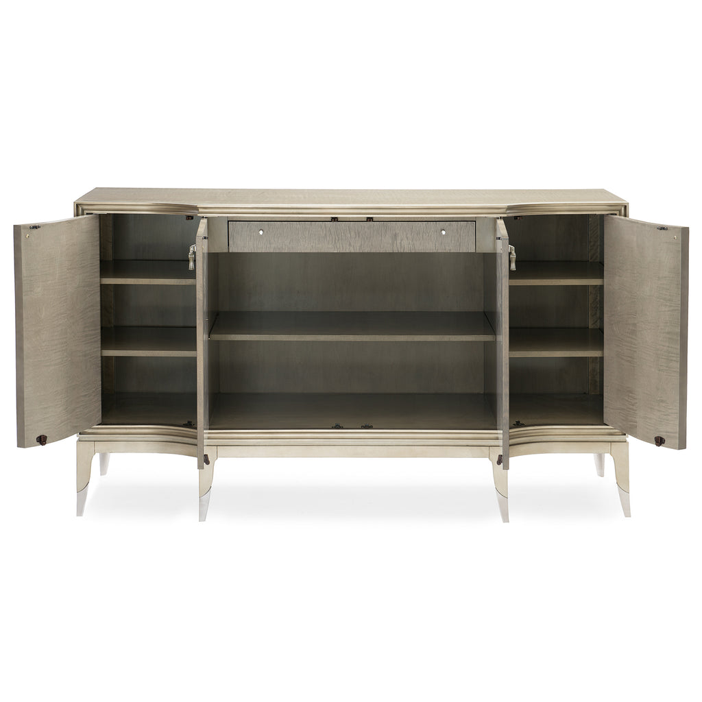 Handpicked for its timeless style, this credenza offers modern glamour. As functional as it is fashionable, it features an adjustable shelf and silver tray drawer behind its two middle drawers. Inside its two end doors are adjustable shelves and a painted interior in Silver Glaze. A unifying palette of Moonlit Sand, Soft Silver Leaf, Silver Glaze, and Lightly Brushed Chrome combine to add shimmering reflectivity and sophisticated appeal.