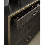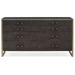 If ever there was a dresser that could make you stop and do a double-take, this is the one. Bold in character, its modern mix of finishes and materials conveys understated urban flair. A rich Black Stained Ash finish wraps around its clean-lined silhouette while its drawer fronts are highlighted in Cerused Oak paired with coordinating custom hardware. With eight drawers, fully finished in Black Stained Ash, there's room for all of your wardrobe essentials. The character of this fashion-forward double dresser is further enhanced by its metal frame and trim finished in a softly reflective Bronze Metallic Paint.