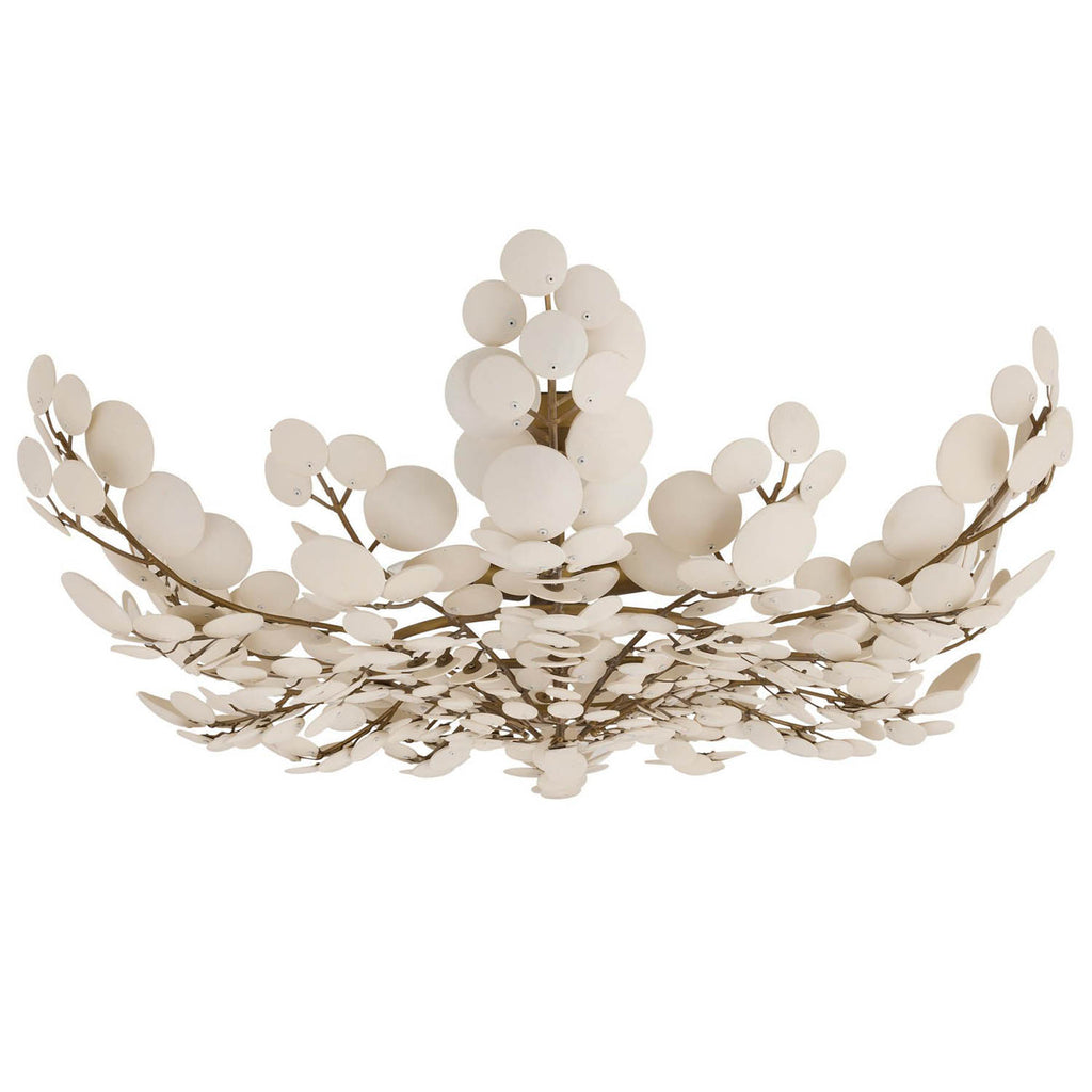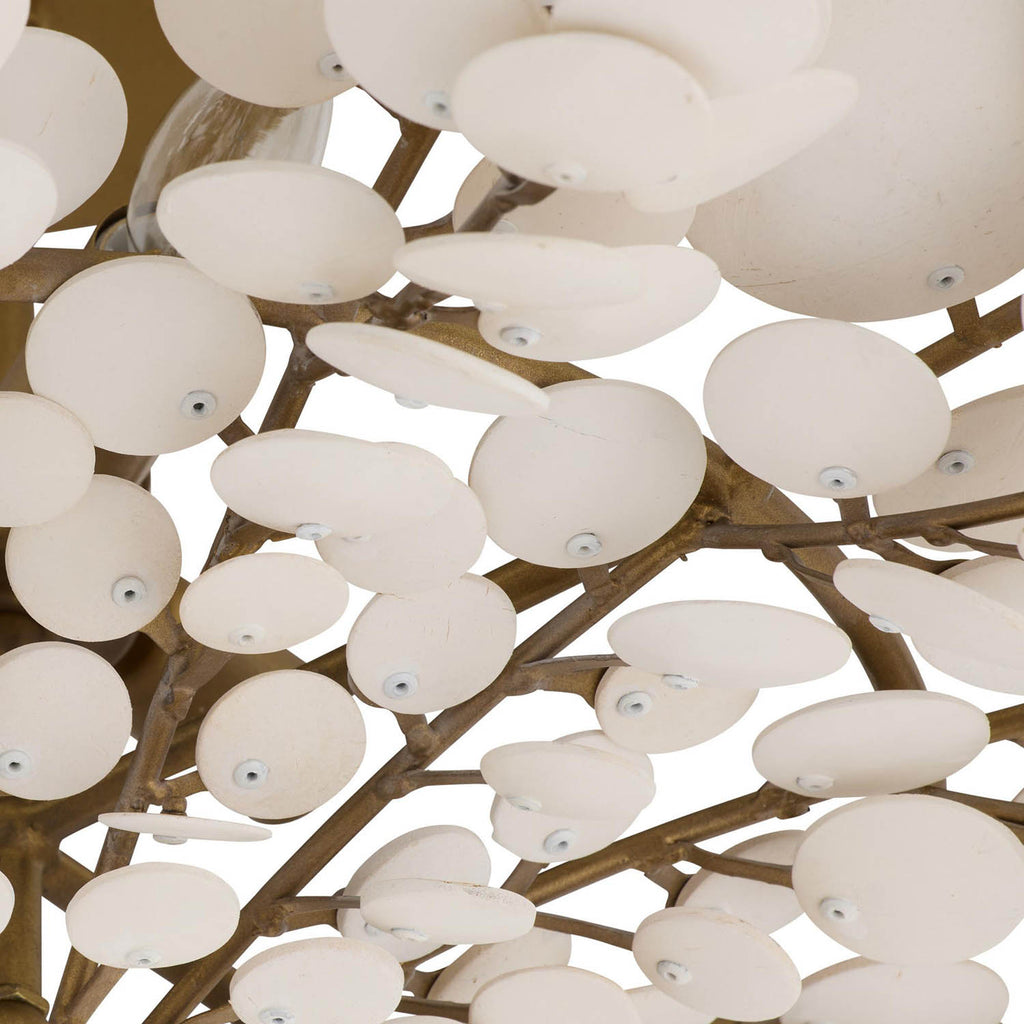 The lush allure of tropical foliage informs the Bilal. From afar, this botanically inspired fixture resembles metal but is cleverly constructed of coconut shells. Updated in a neutral ivory hue, it is a stylish companion to our Bilal chandelier. Suspended from an antique brass iron canopy. Finish will vary.