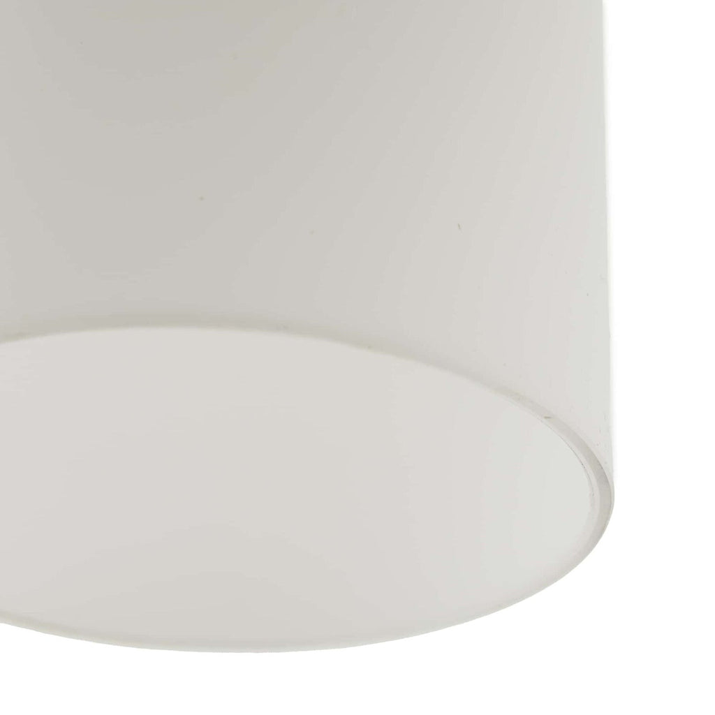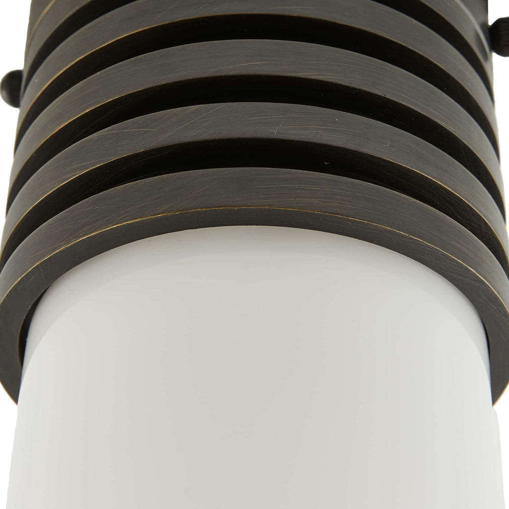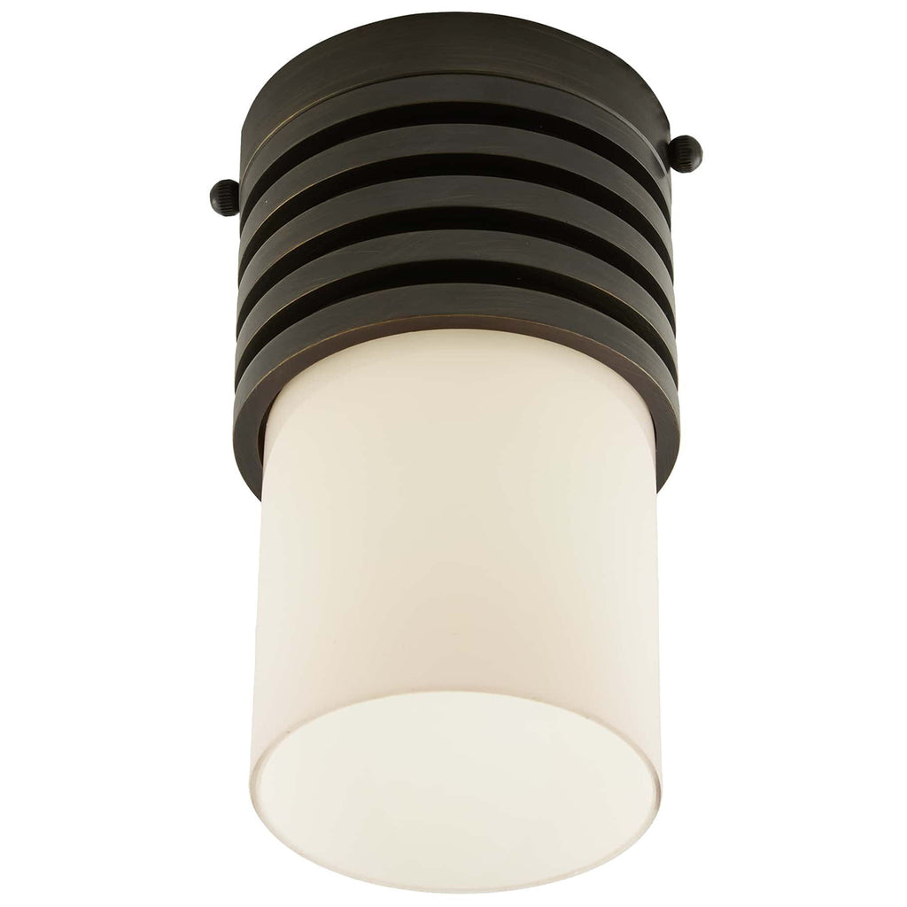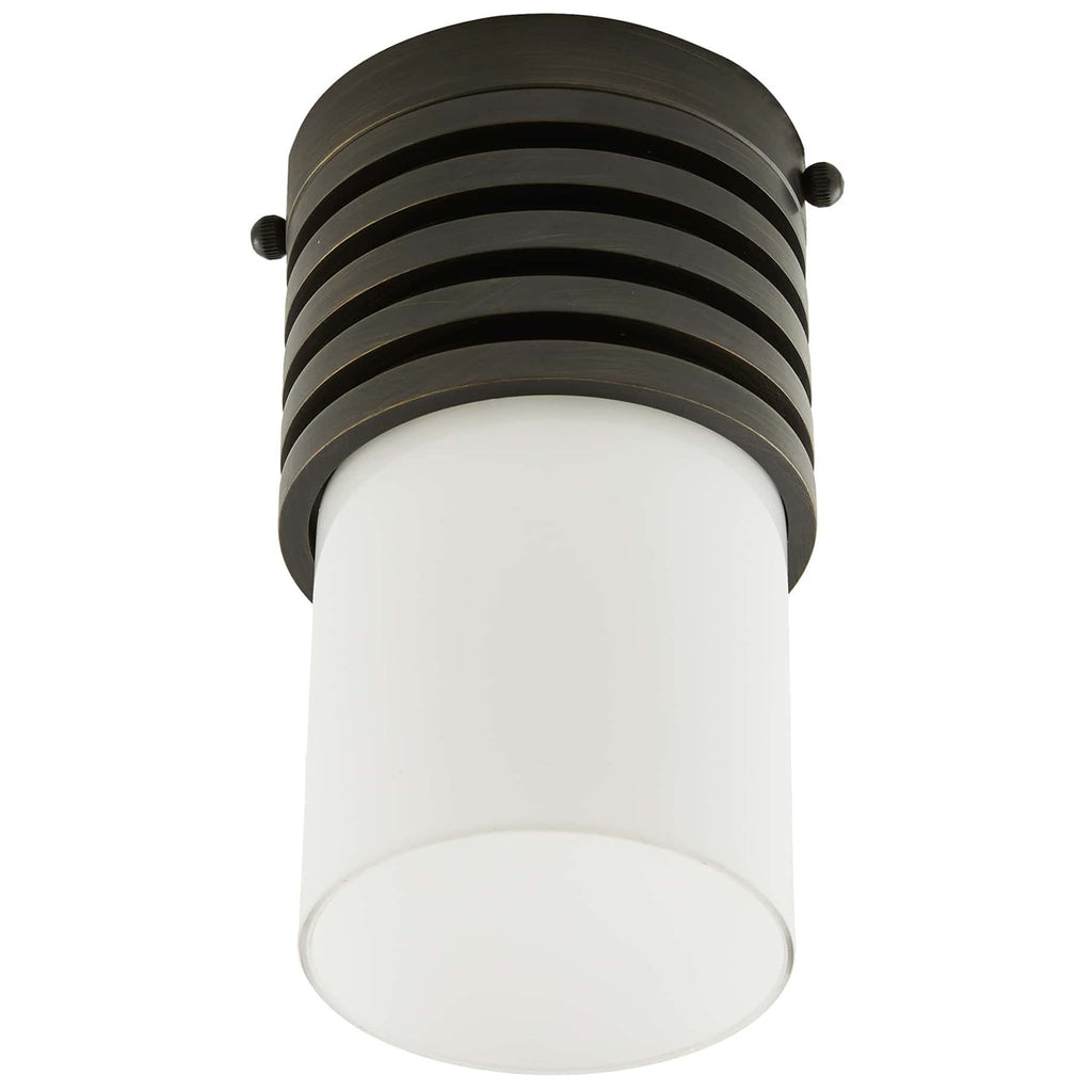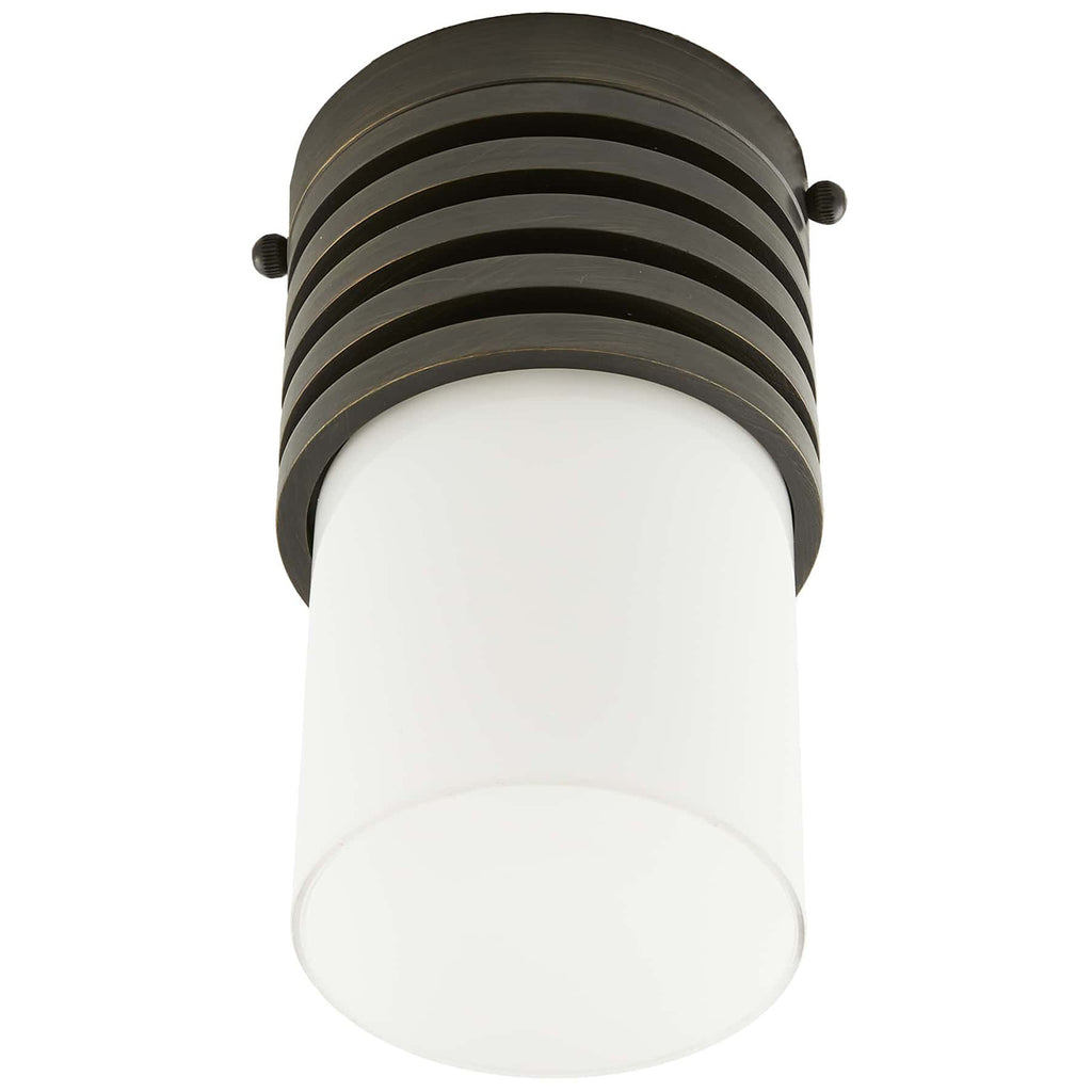 Formed with a machined look, as if turned on a lathe, the Arteriors Rune flush mount is finished in steel with an opal glass cylinder shade. The fixture is scaled as an ideal hallway application or as a decorative swap for can lights.