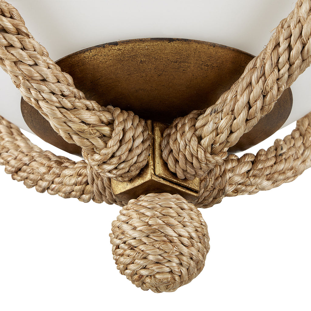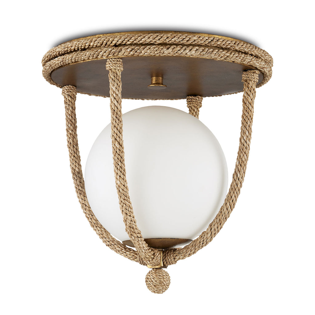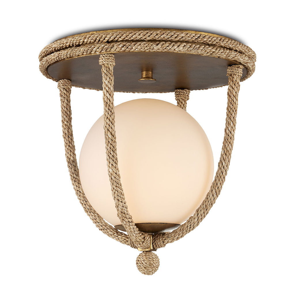 The Currey & Co Passageway Flush Mount is a cleverly designed rope-wrapped ceiling light by Clarence Mallari. The warmth of the rope combined with the dorado gold finish contrasts the frosted glass globe to bring this design heft. One of the arms that hold the globe in place is removable to make changing the bulbs on this brown ceiling light easy.
