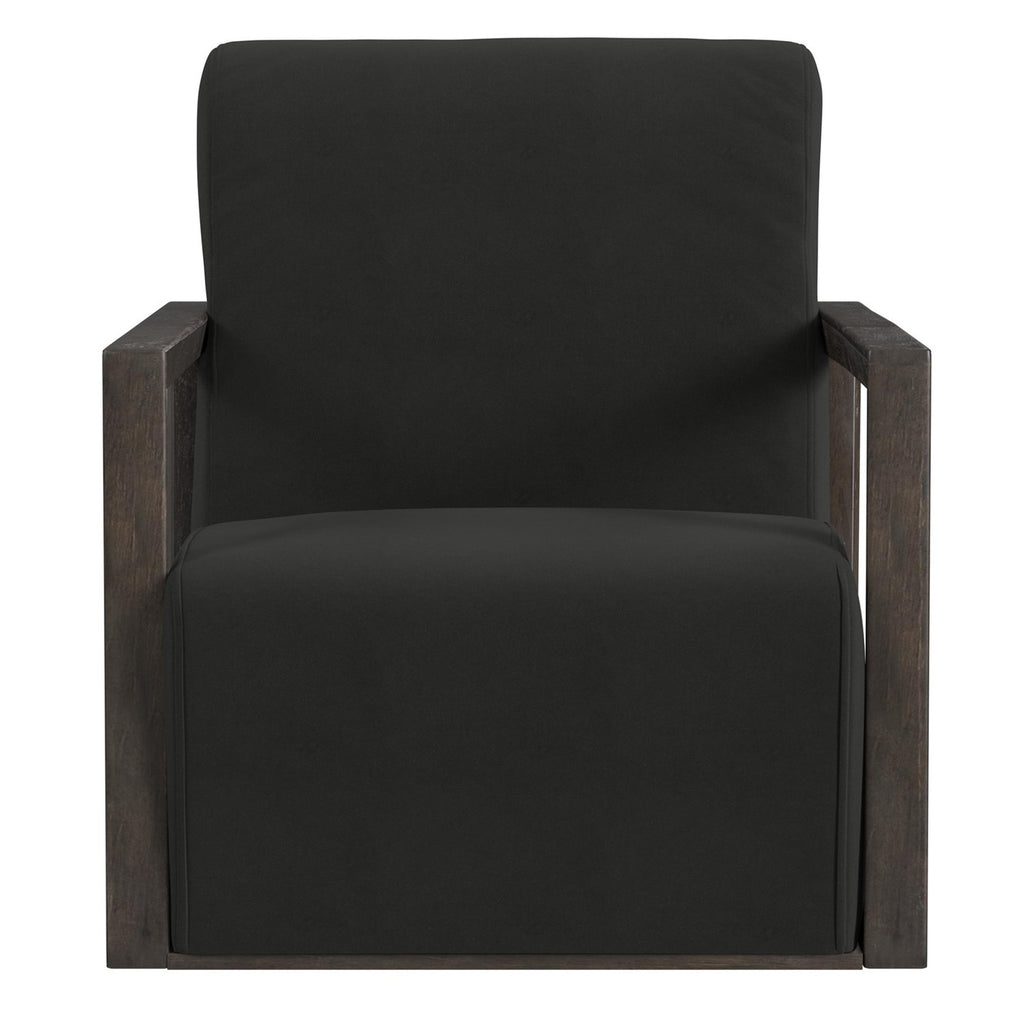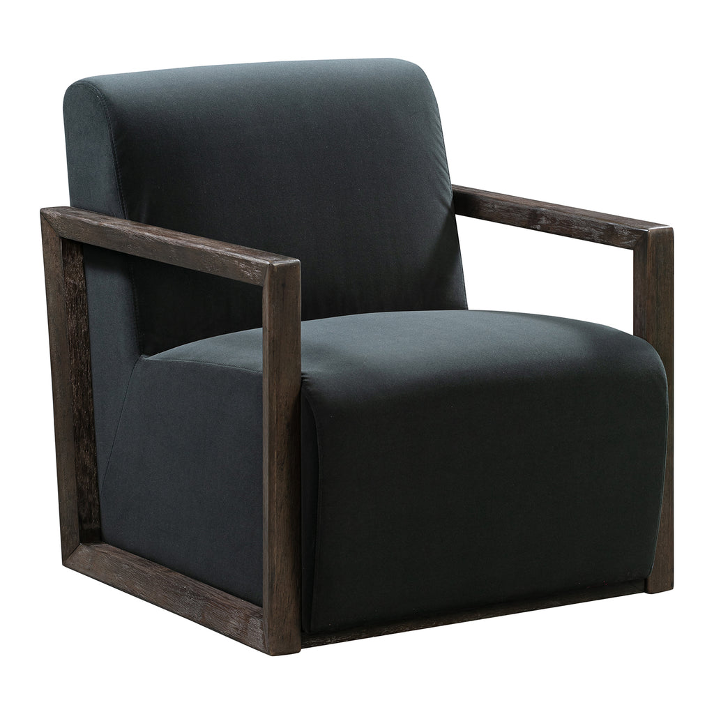 The Asher Accent Chair has a modern inspired silhouette. The dark, solid wood frame features wire brushing with beveled details for extra dimension. This accent chair features a clean tailored seat in a dry, low-pile smoke velvet that is durable and soft to the touch. The comfortable over-sized, deep seat is constructed with zig-zag springs and webbing for durability and support. Ships fully assembled.