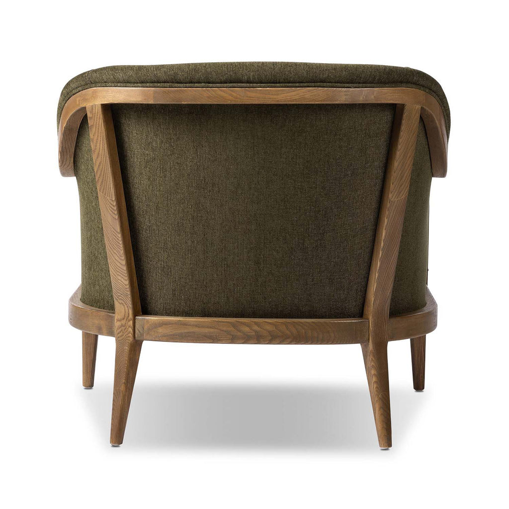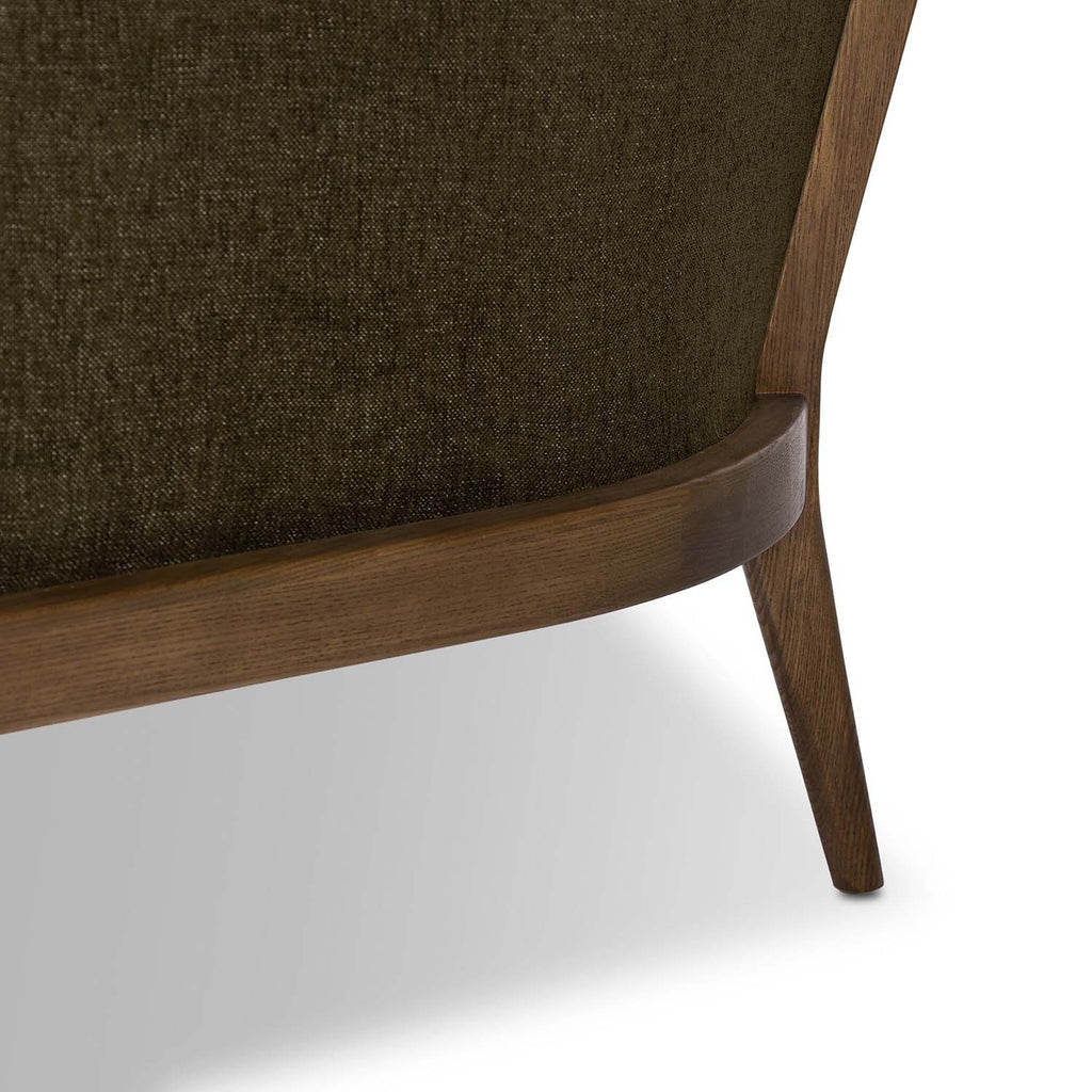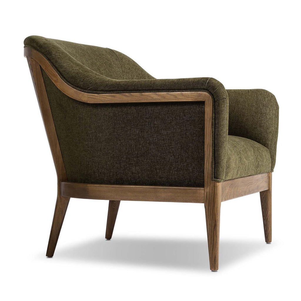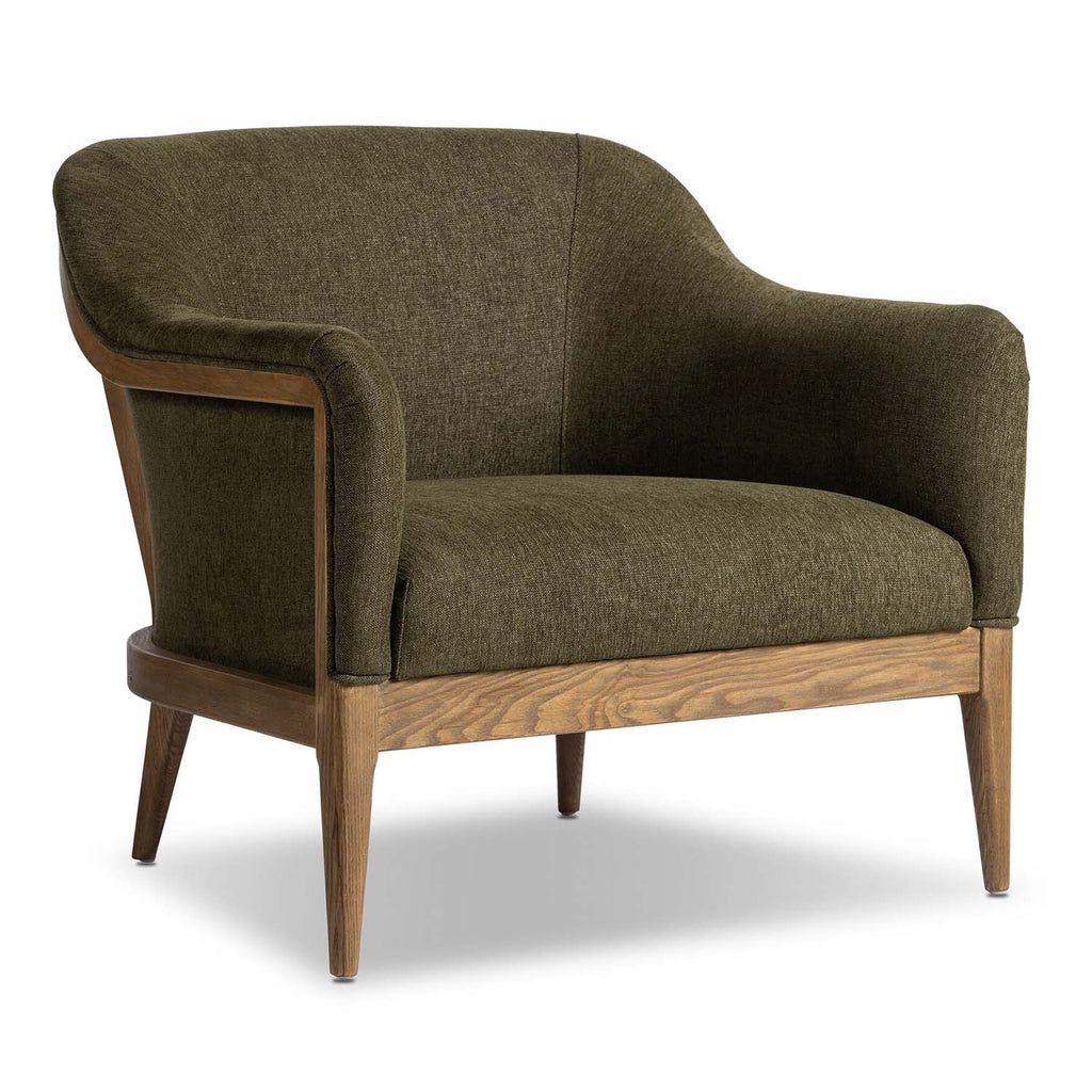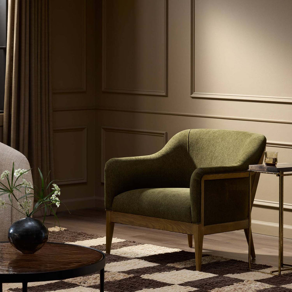 A Swedish Gustavian inspired captain chair gets a modern update with high arms and an exposed frame. The tight cushion in olive fabric paired with buff parawood lends a luxe natural feel.