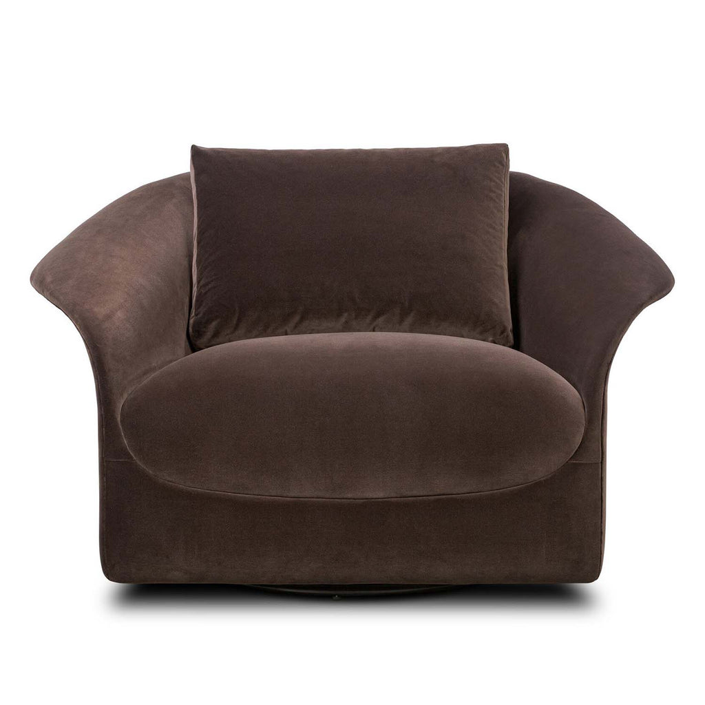 Curved lines and a swivel function make this accent chair equal parts style and substance. Winged arms add sculptural drama, while plush seating and back cushions deliver understated comfort. Upholstered in a slightly heathered fabric with subtle highs and lows throughout.