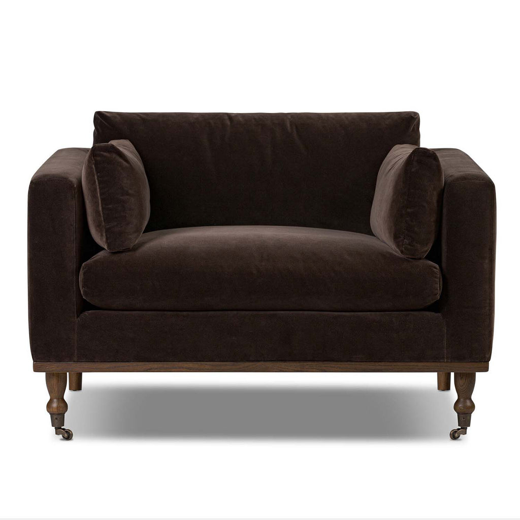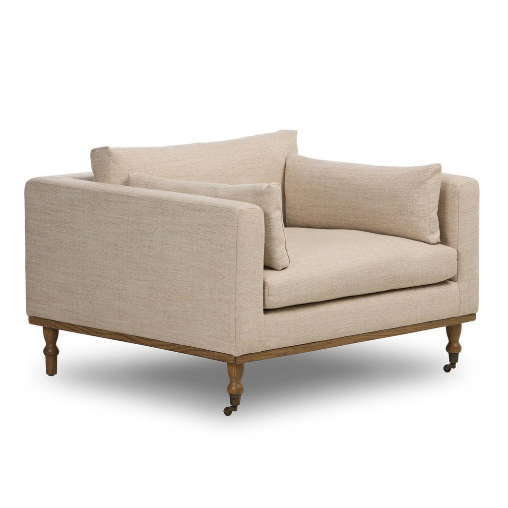 With traditional details like turned oak legs and brass casters, this low-profile accent chair features an elongated bench seat for an inviting sit. Performance fabric in neutral wheat finishes a knife-edge back and boxed arm cushions.