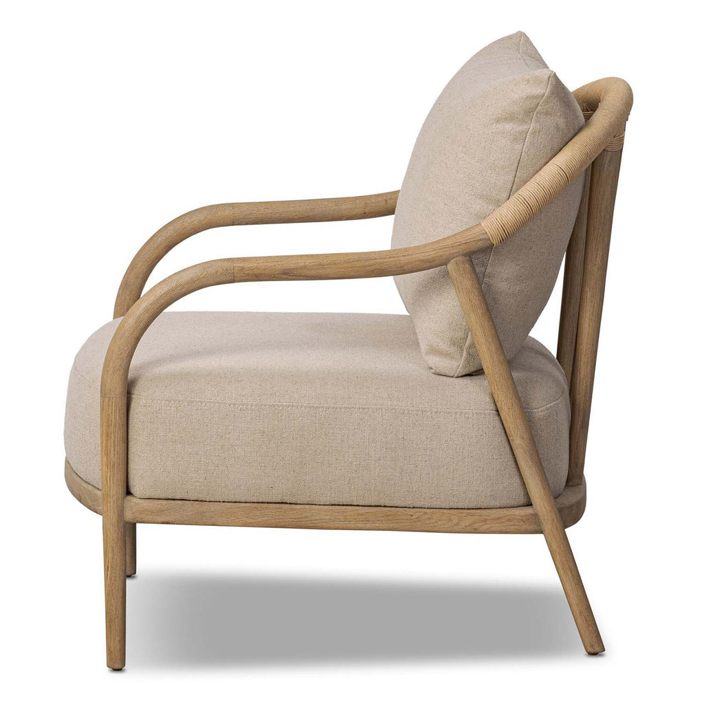Capturing the ease of tropical ratan seating, an oversized indoor chair is shaped from oak and wrapped with rush cord detailing. Exemplary woodworking is seen in the fluid lines that end with sturdy spindle legs supporting the comfortable S-spring fixed seat and loose cushion, upholstered in taupe burlap fabric. Performance fabrics are specially created to withstand spills, stains, high traffic and wear, ensuring long-term comfort and unmatched durability.