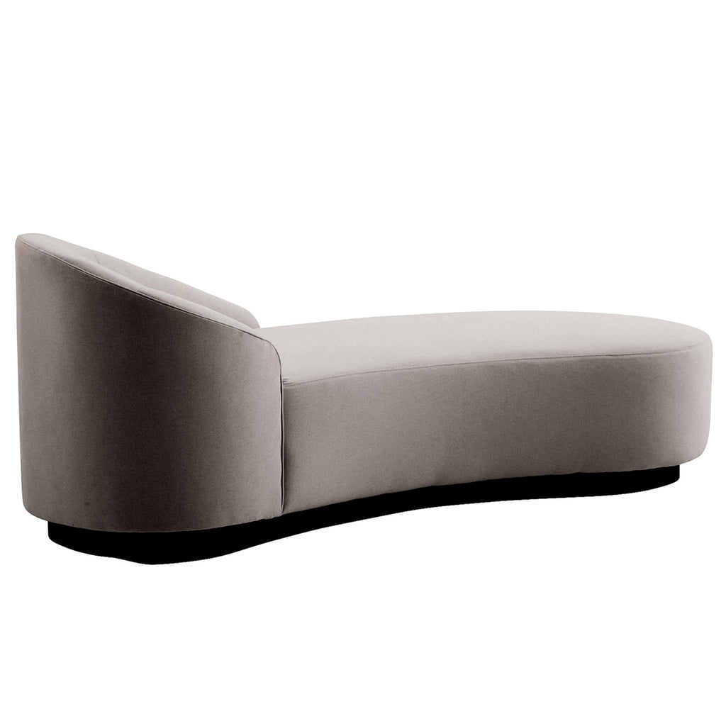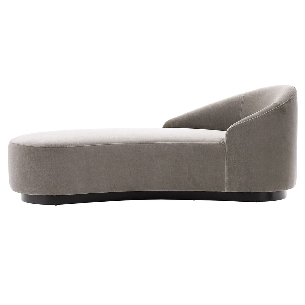A glamorous chaise with a long, sexy curve, upholstered in sharkskin velvet with a grey ash wood frame (right arm). Fabric and finish will vary.