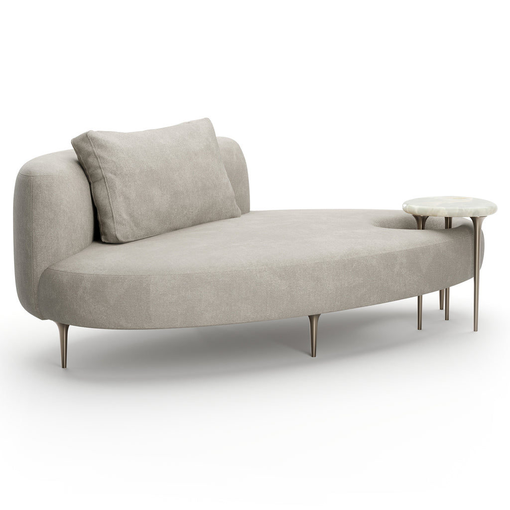 The Echo Lounge combines plush upholstery in pale grey mohair with Champagne Gold metal legs and table supports. Its integrated accent table crafted from luxurious Gray Onyx stone provides sophisticated functionality, making it an exquisite addition to your living area.